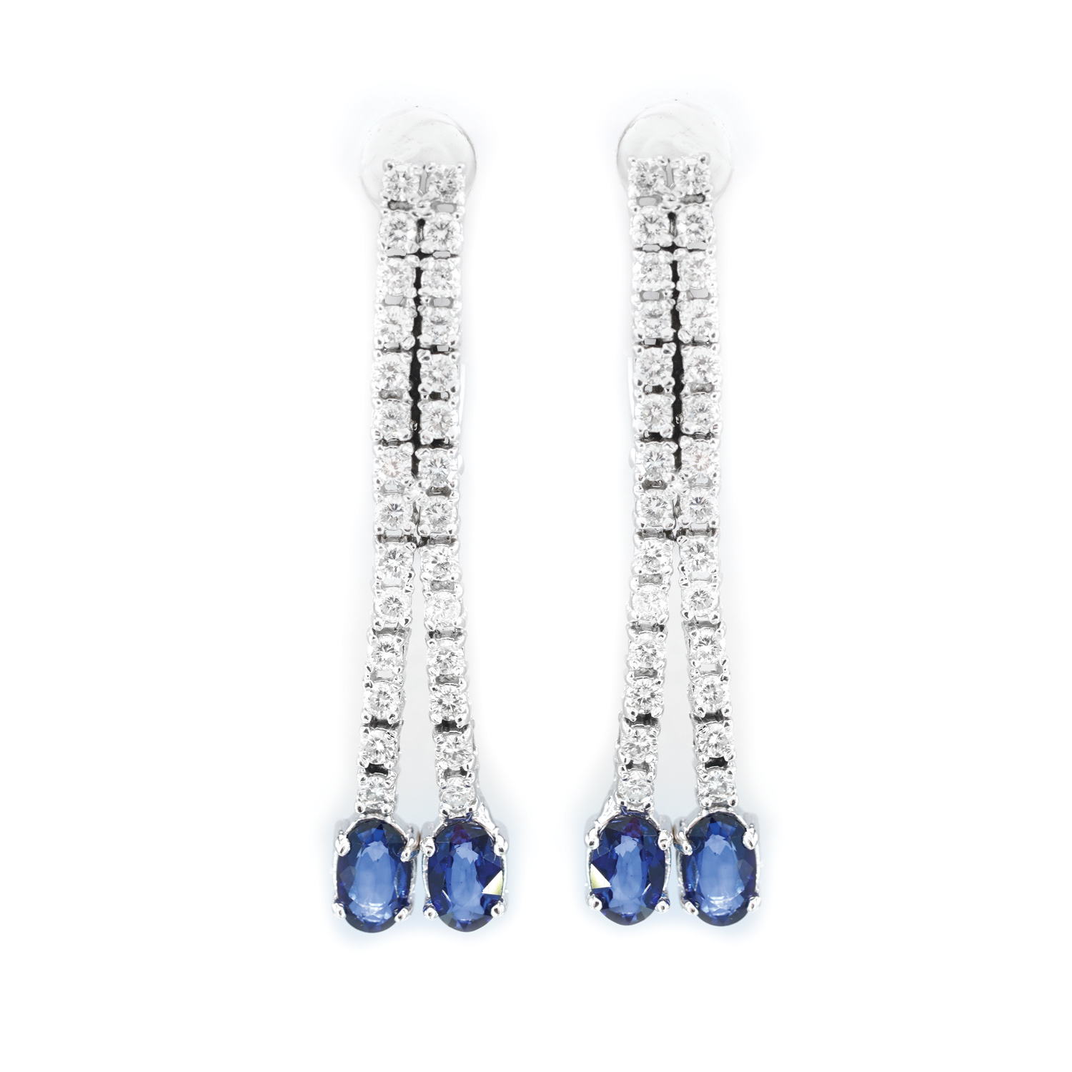 32. A pair of white gold earrings, adorned with sapphires and diamonds