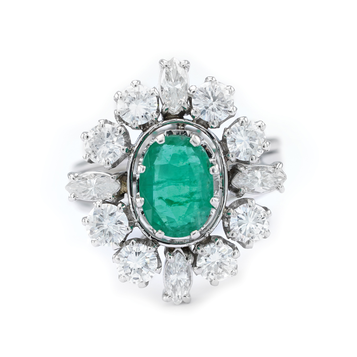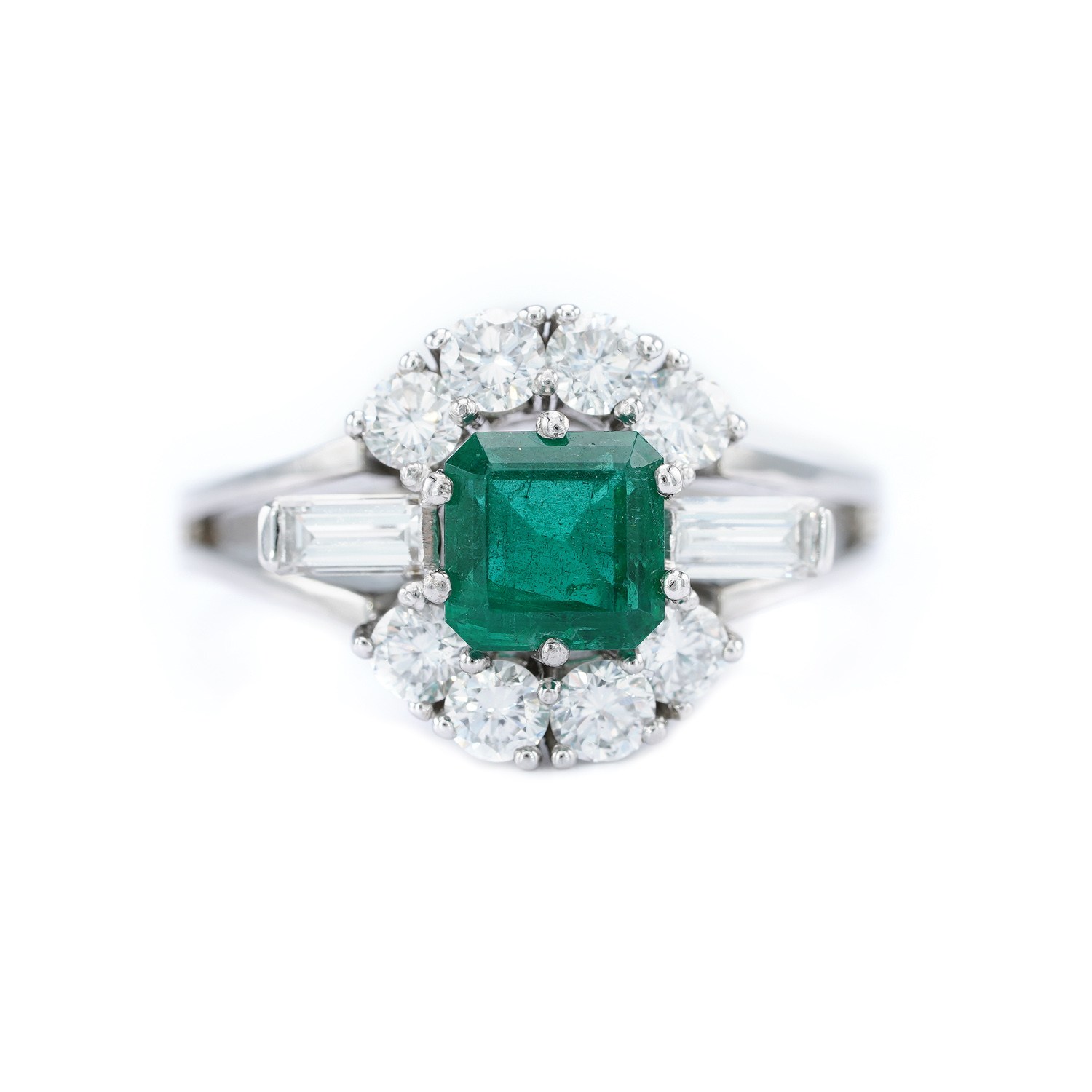 27. Platinum ring decorated with emerald encrusted with diamonds