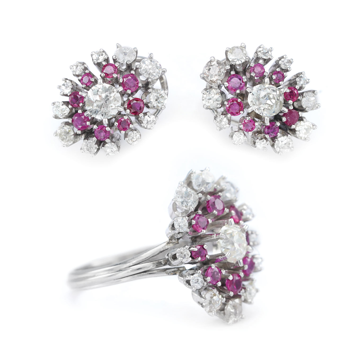 34. Set of white gold, consists of a ring and a pair of earrings, decorated with diamonds and rubies