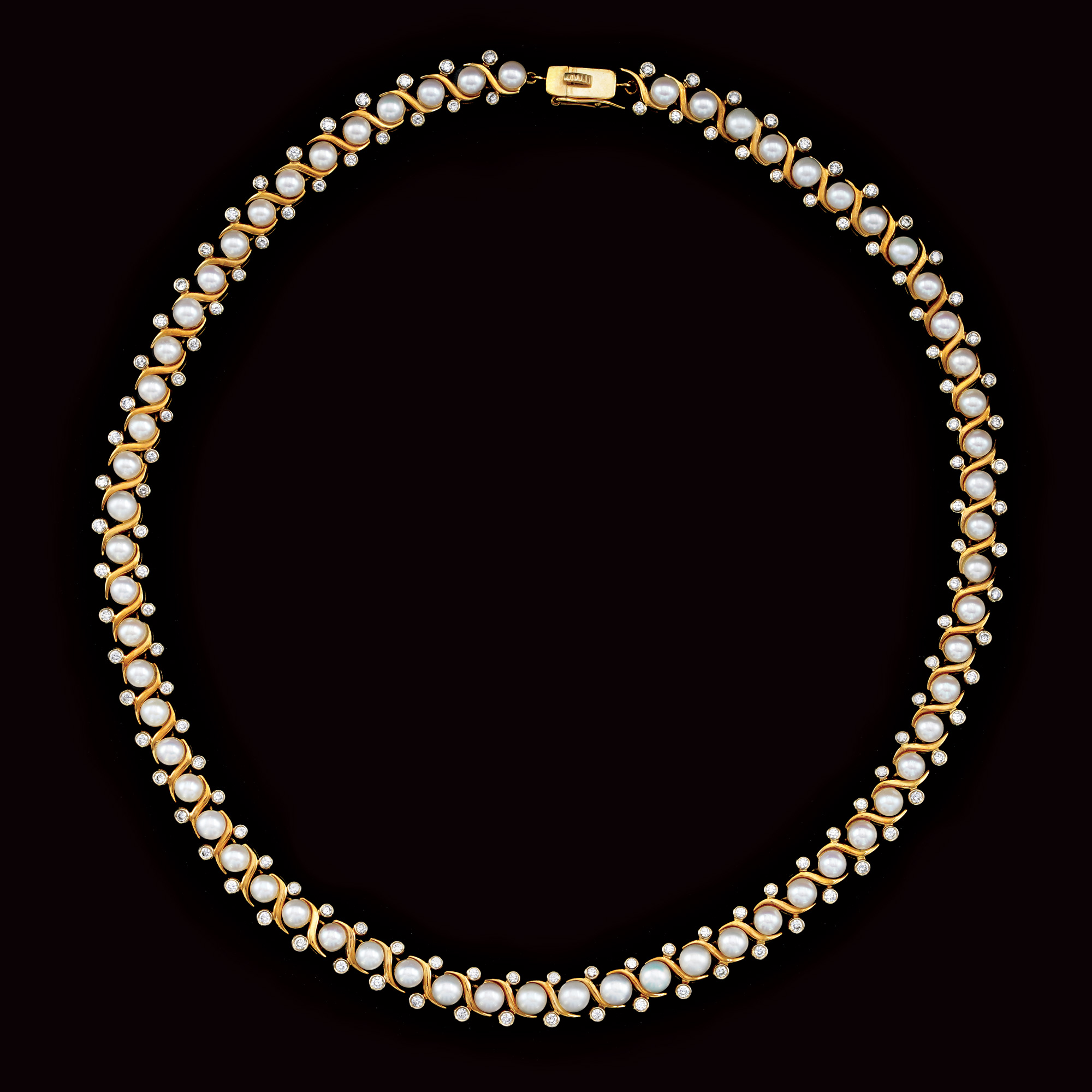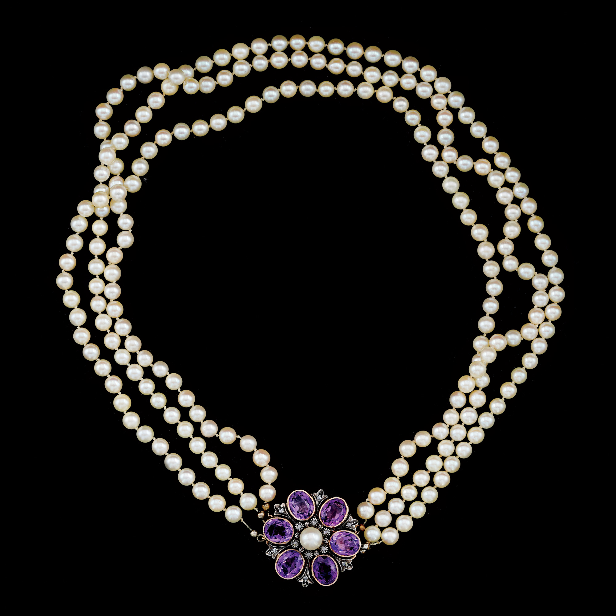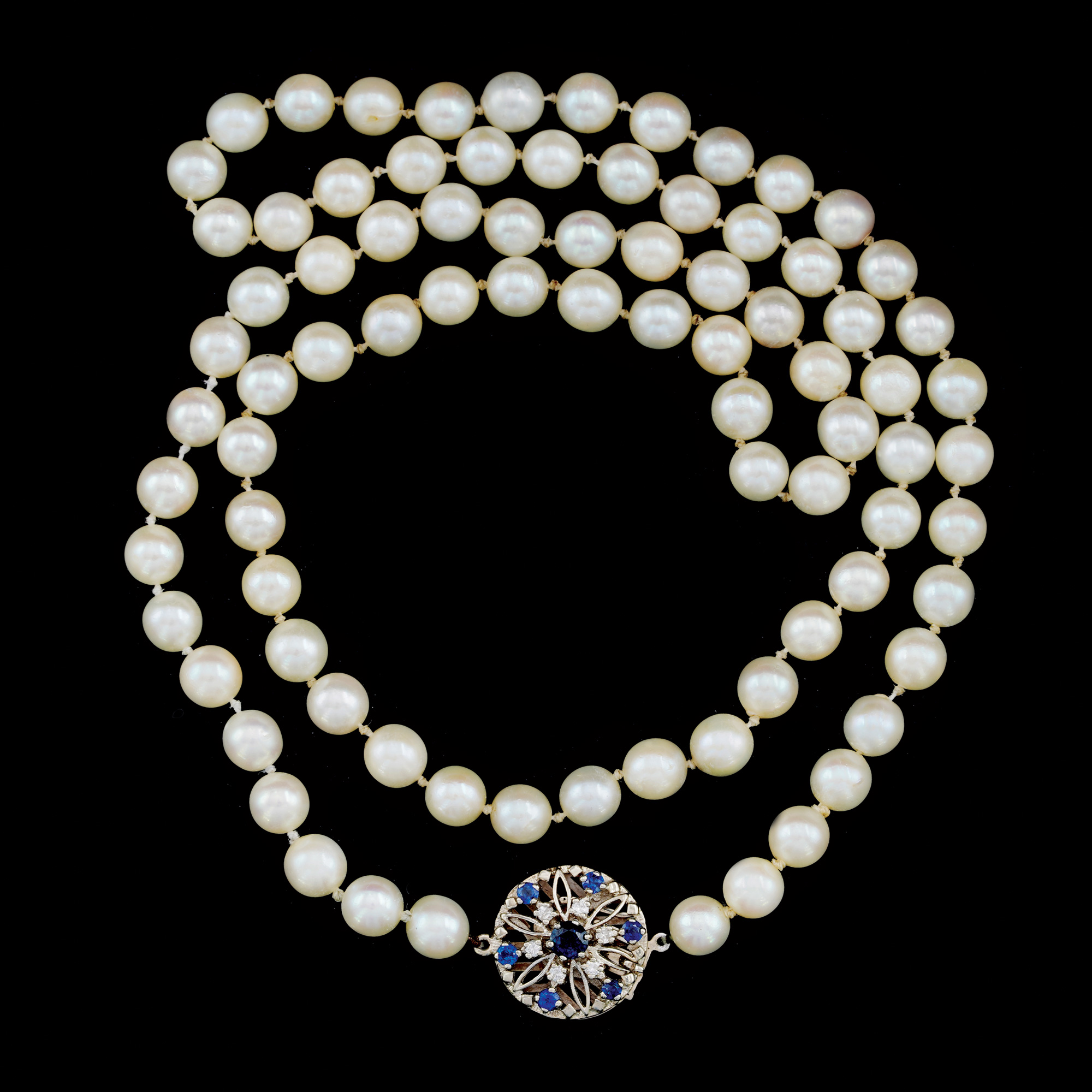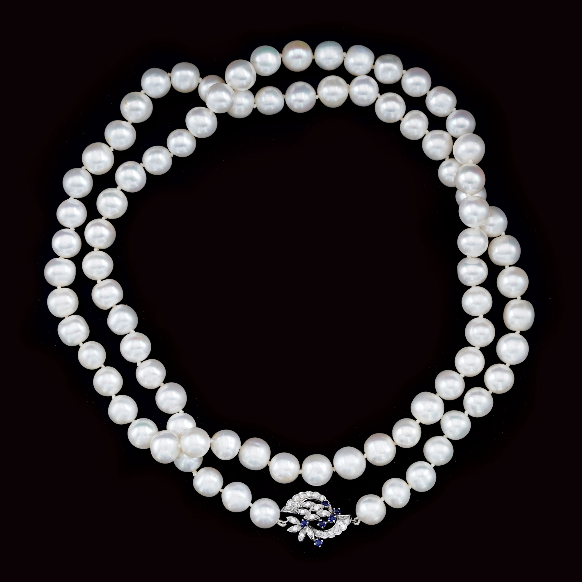 5. Akoya Pearl Necklace with White Gold Clasp, Decorated with Sapphires and Diamonds
