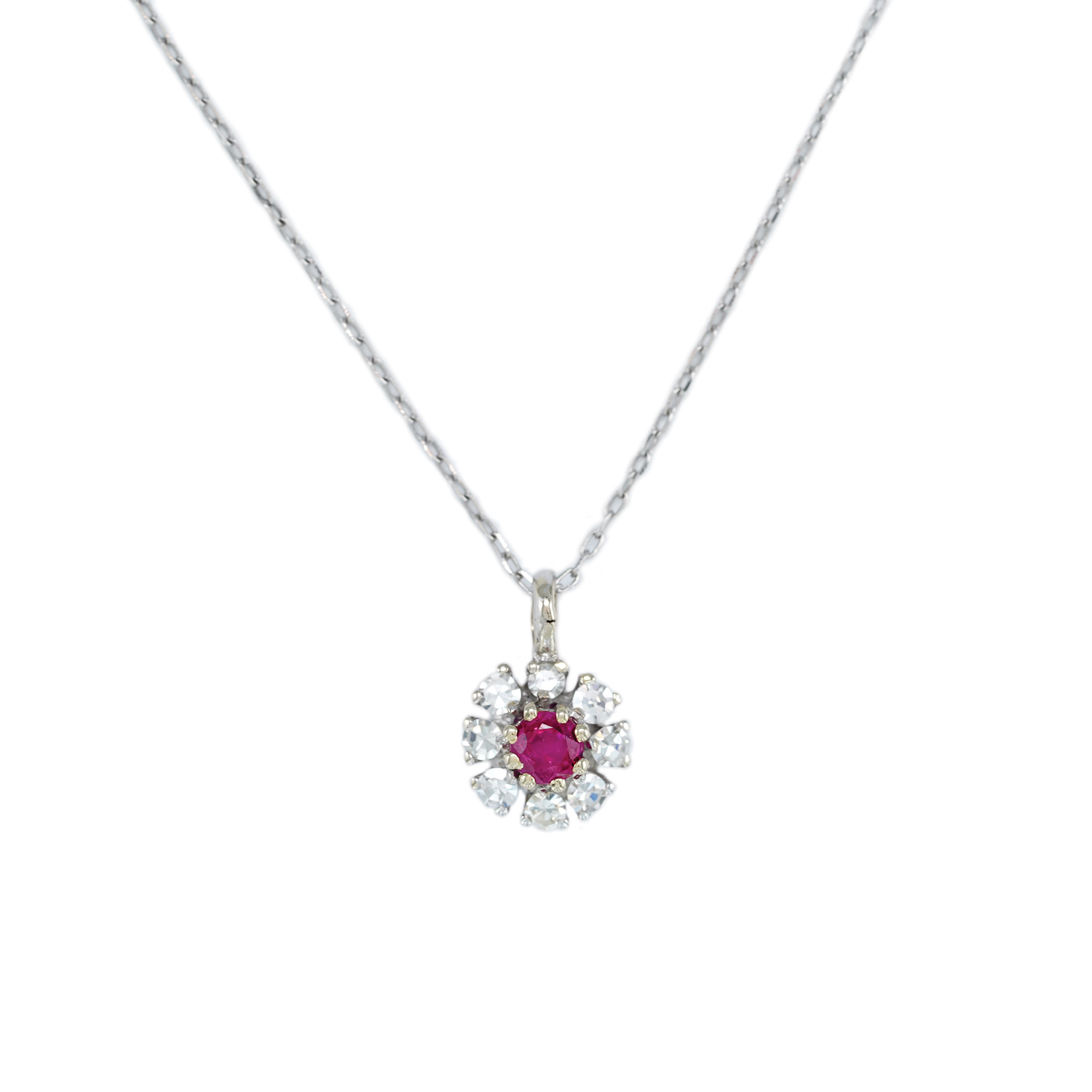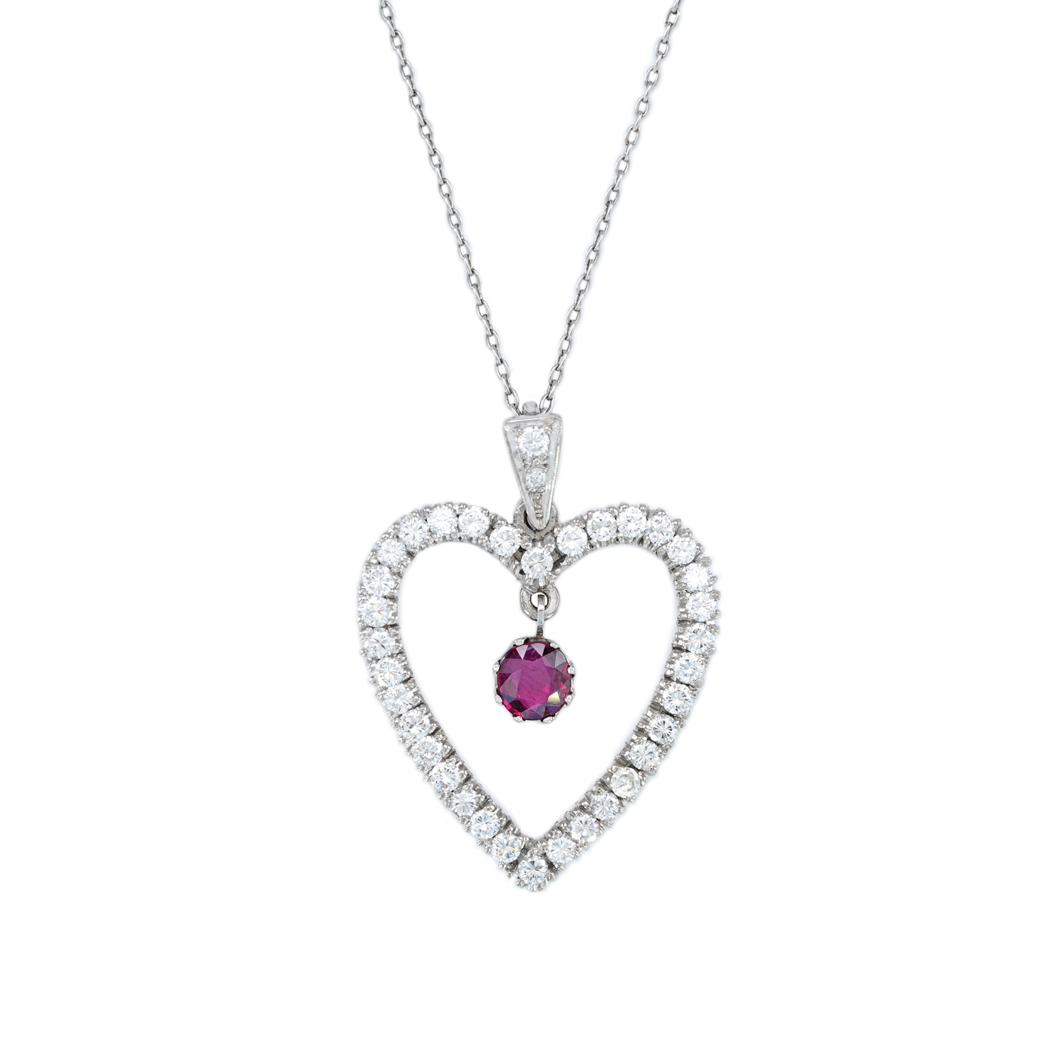 10. White gold necklace with a heart-shaped pendant adorned with a ruby and diamonds
