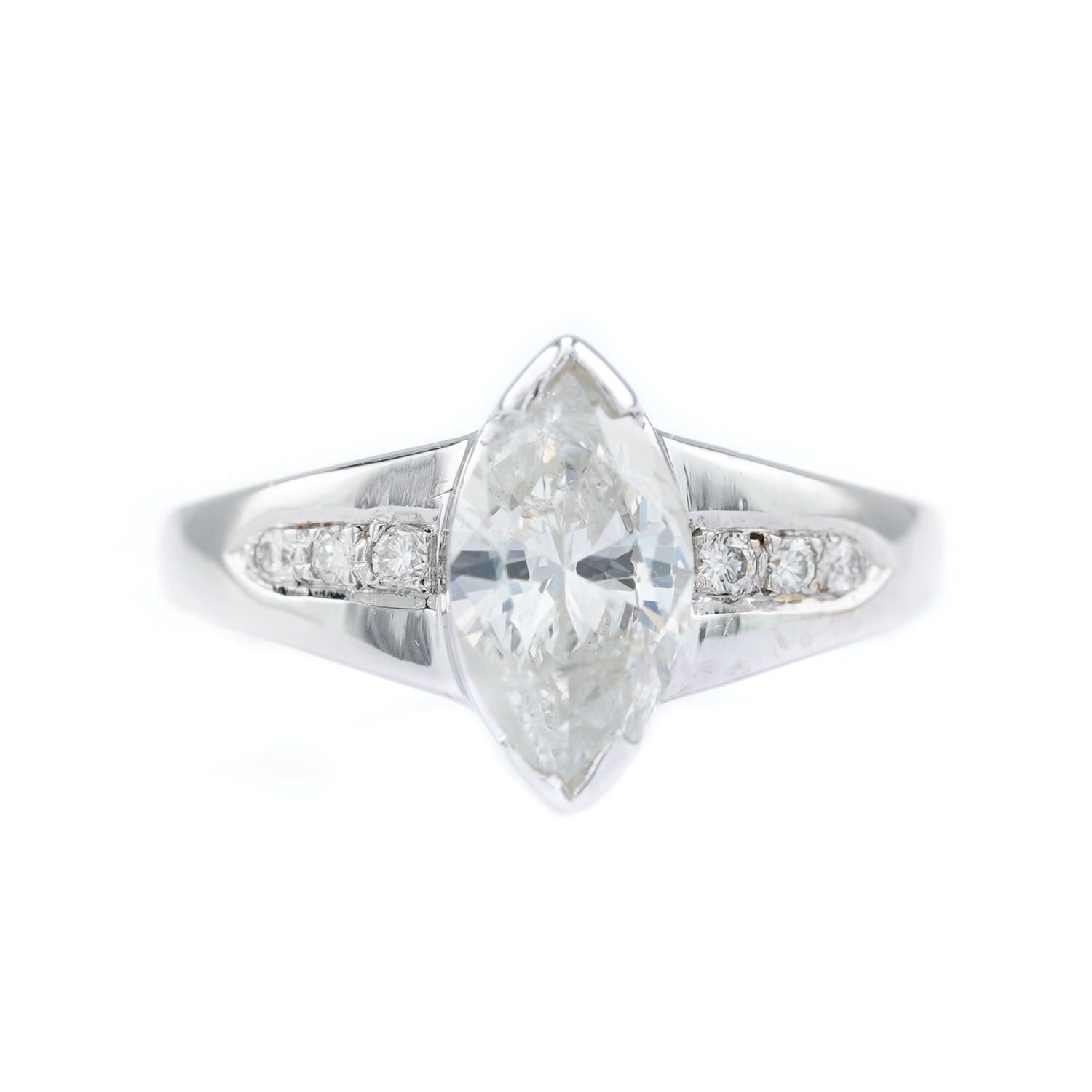 13. White gold ring, decorated with a marquise diamond surrounded by brilliants