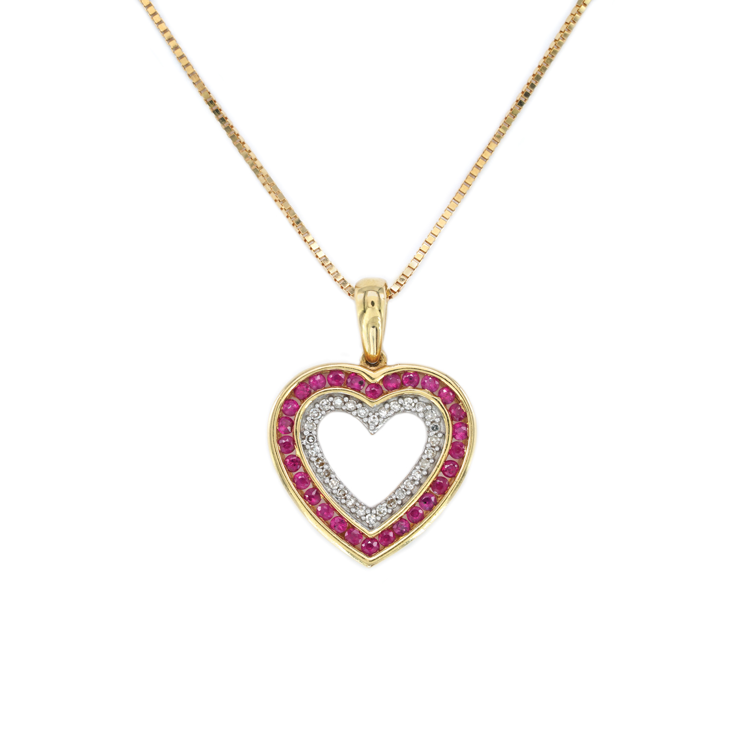 12. Gold necklace with a heart-shaped pendant, adorned with rubies and diamonds