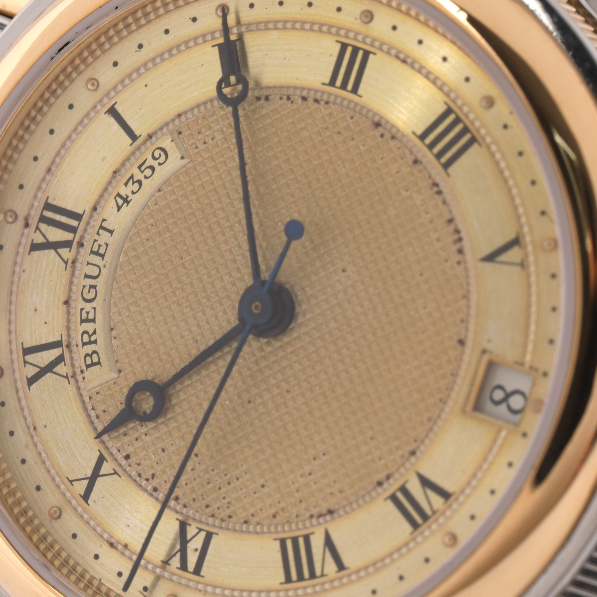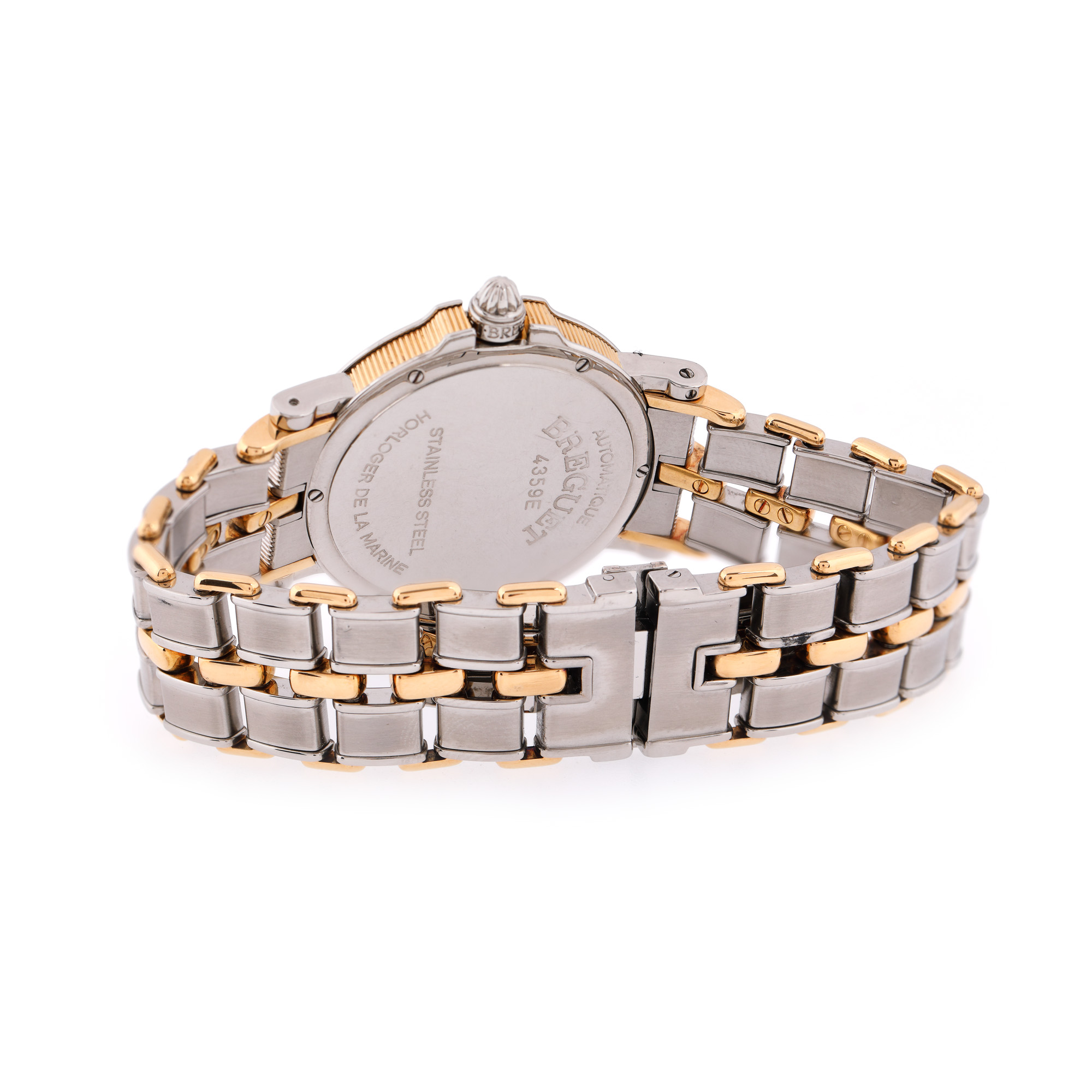 Ceas Breguet Marine, de mână, unisex, referință 4359e, mecanism automatic. Cadran de culoare auriu, numerale romane și registru pentru dată în dreptul orei 6. Brățară și sistem de închidere tip deployant, originale.