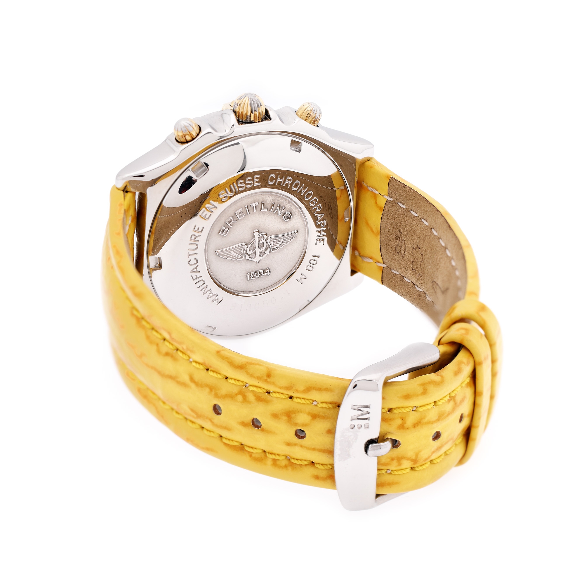 Ceas Breitling Chronomat, de mână, bărbătesc, referință B13050.1, mecanism automatic. Cadran de culoare auriu, trei registre și registru pentru dată, în dreptul orei 3. Curea din piele, de culoare neagră, adăugată aftermarket și sistem de închidere tip deployant, original. Accesorii: ceasul vine însoțit de curea din piele, de culoare galbenă și cataramă din oțel, adăugate aftermarket.
