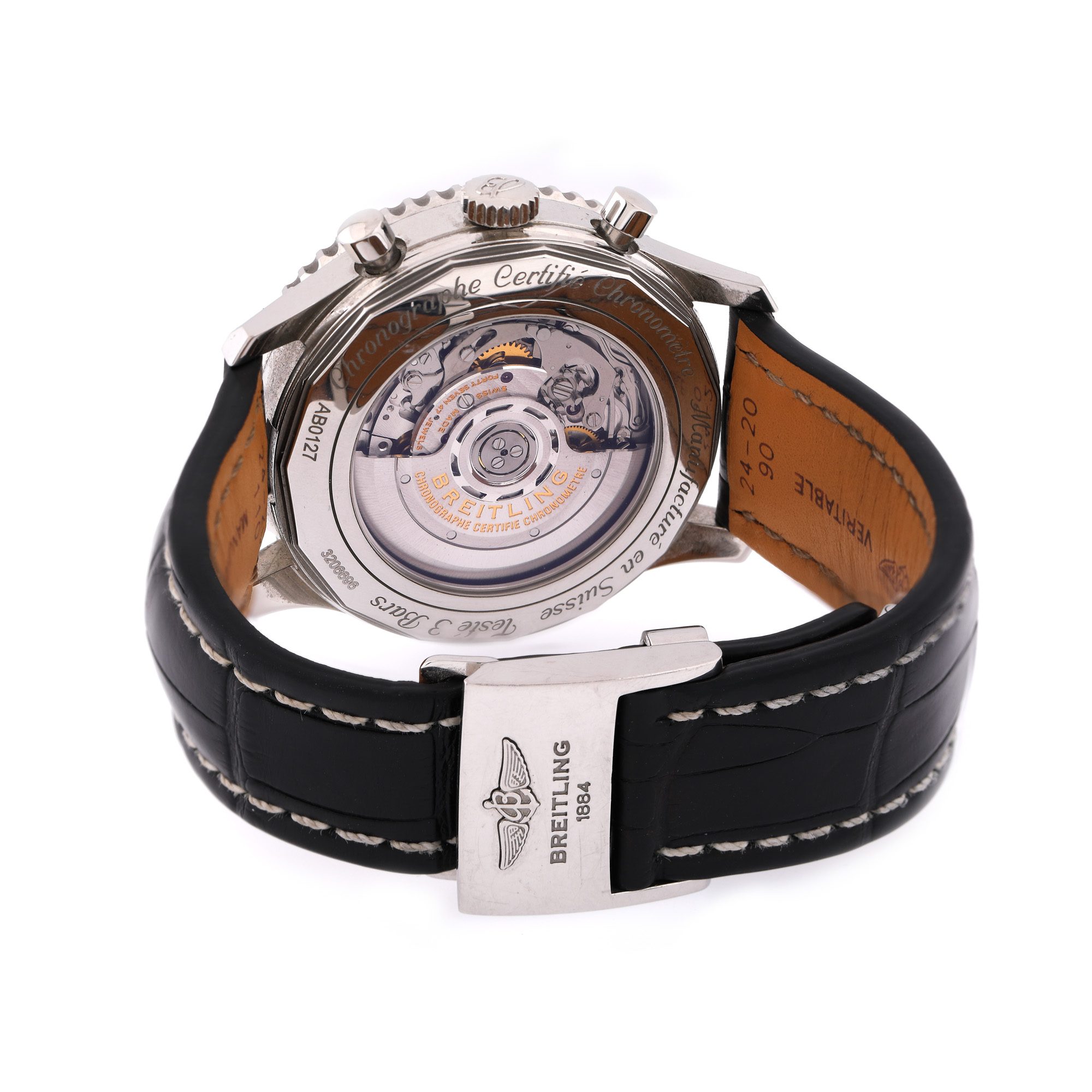Ceas Breitling Navitimer, de mână, bărbătesc, referință AB0127, mecanism automatic, anterior vitrat. Cadran de culoare negru, trei registre, bezel rotativ bi-direcțional și registru pentru dată între orele 4-5. Curea din piele de culoare neagră și sistem de închidere tip deployant, originale. Acest model a fost purtat de celebrități precum Jerry Seinfeld, Simon Cowell și Kurt Russell.