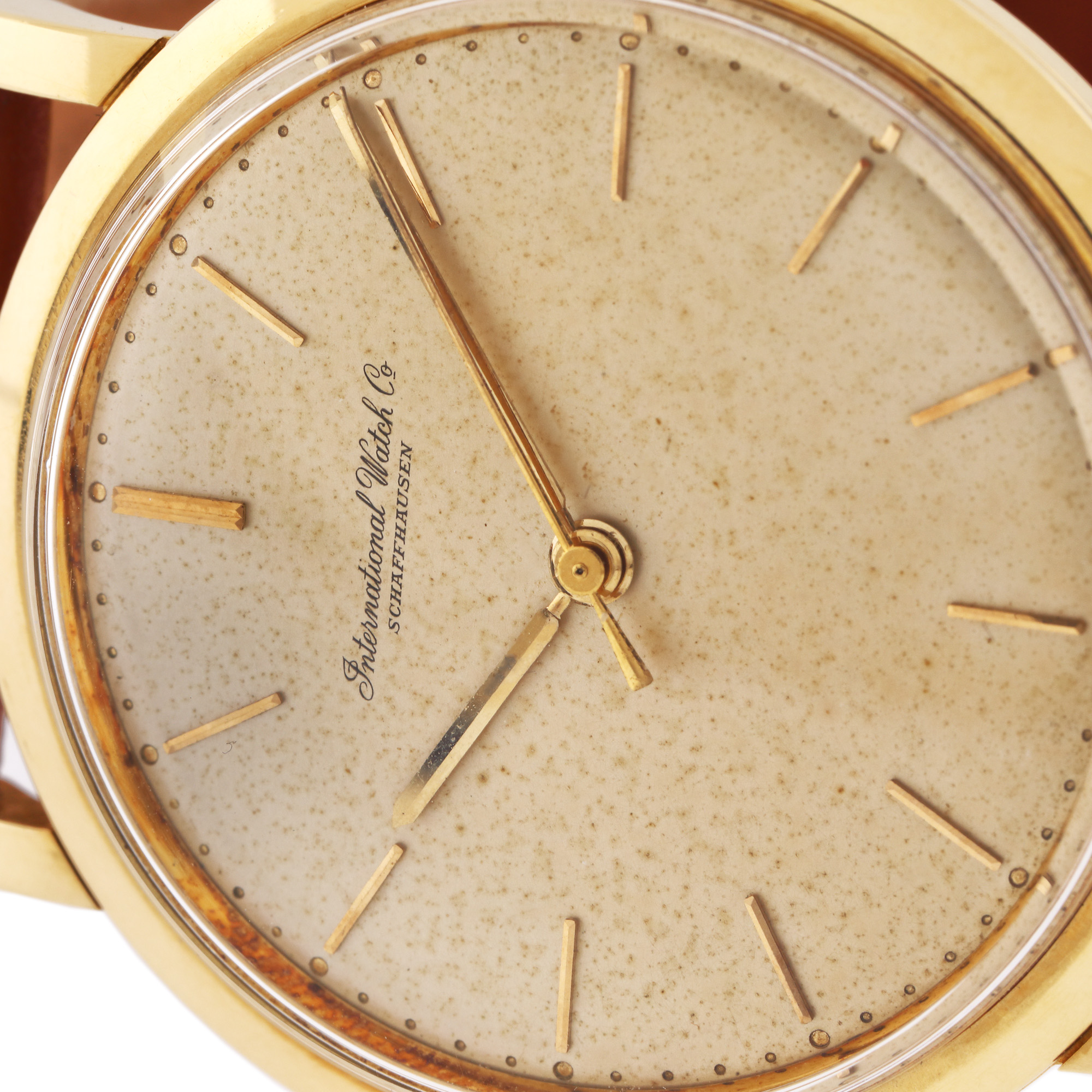Ceas IWC din aur, de mână, bărbătesc, mecanism automatic. Cadran de culoare ivory, cu indici orari din aur. Curea din piele, de culoare maro și cataramă din oțel, înlocuite aftermarket.