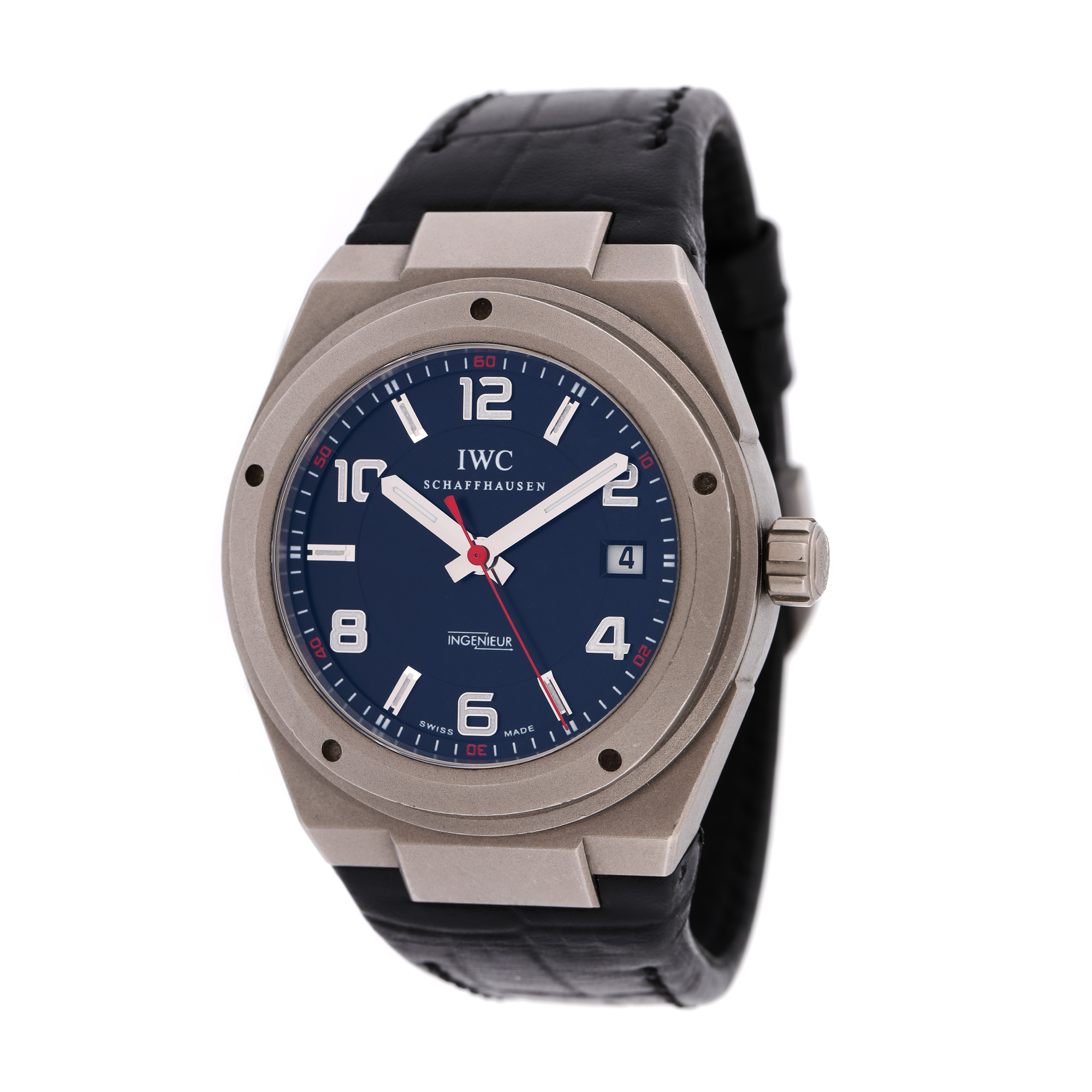 Ceas IWC Schaffhausen Ingenieur Mercedes-Benz AMG, de mână, bărbătesc, referință IWC322703, mecanism automatic. Cadran de culoare albastru, cu numerale arabe și indici orari luminiscenți și registru pentru dată în dreptul orei 3. Curea din piele de aligator, de culoare neagră, adăugată aftermarket și cataramă din titan, originală. Cadranul păstrează elementele de decor ale ceasului încorporat în bordul mașinii Mercedes-AMG G 63. Accesorii: card de garanție nedatat, nesemnat, neștampilat.