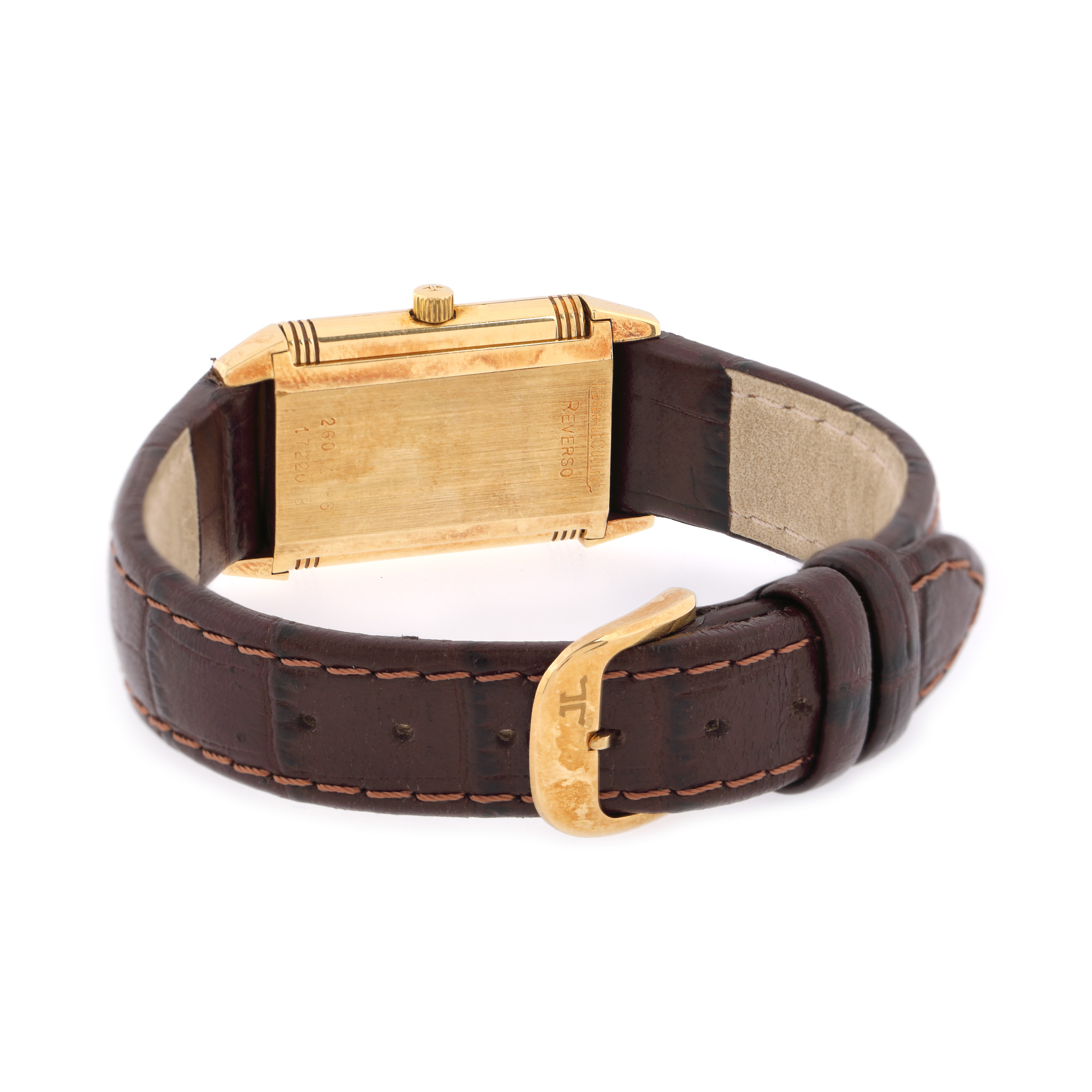 Ceas Jaeger-LeCoultre Reverso din aur, de mână, de damă, referință 260.1.86, mecanism cu armare manuală. Cadran silver și numerale arabe. Curea din piele, de culoare maro, adăugată aftermarket și cataramă din aur, originală.