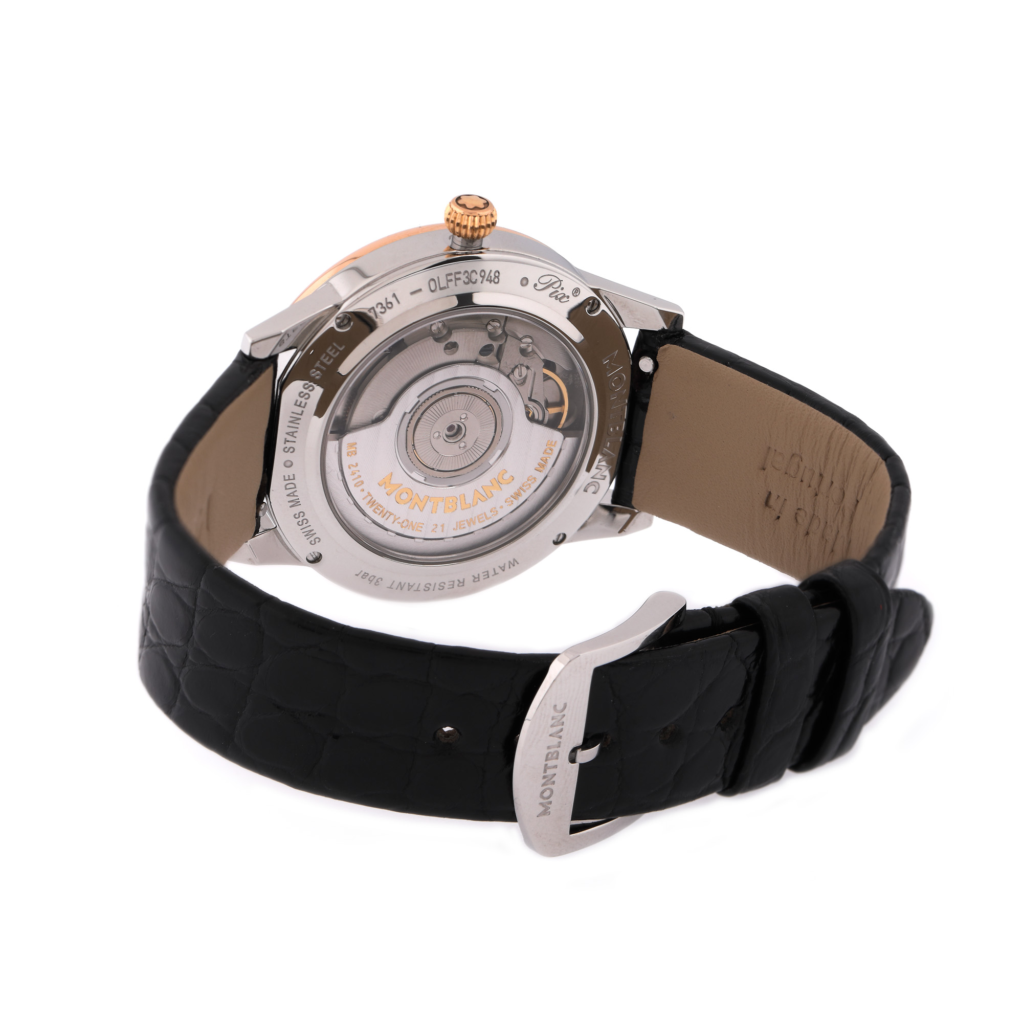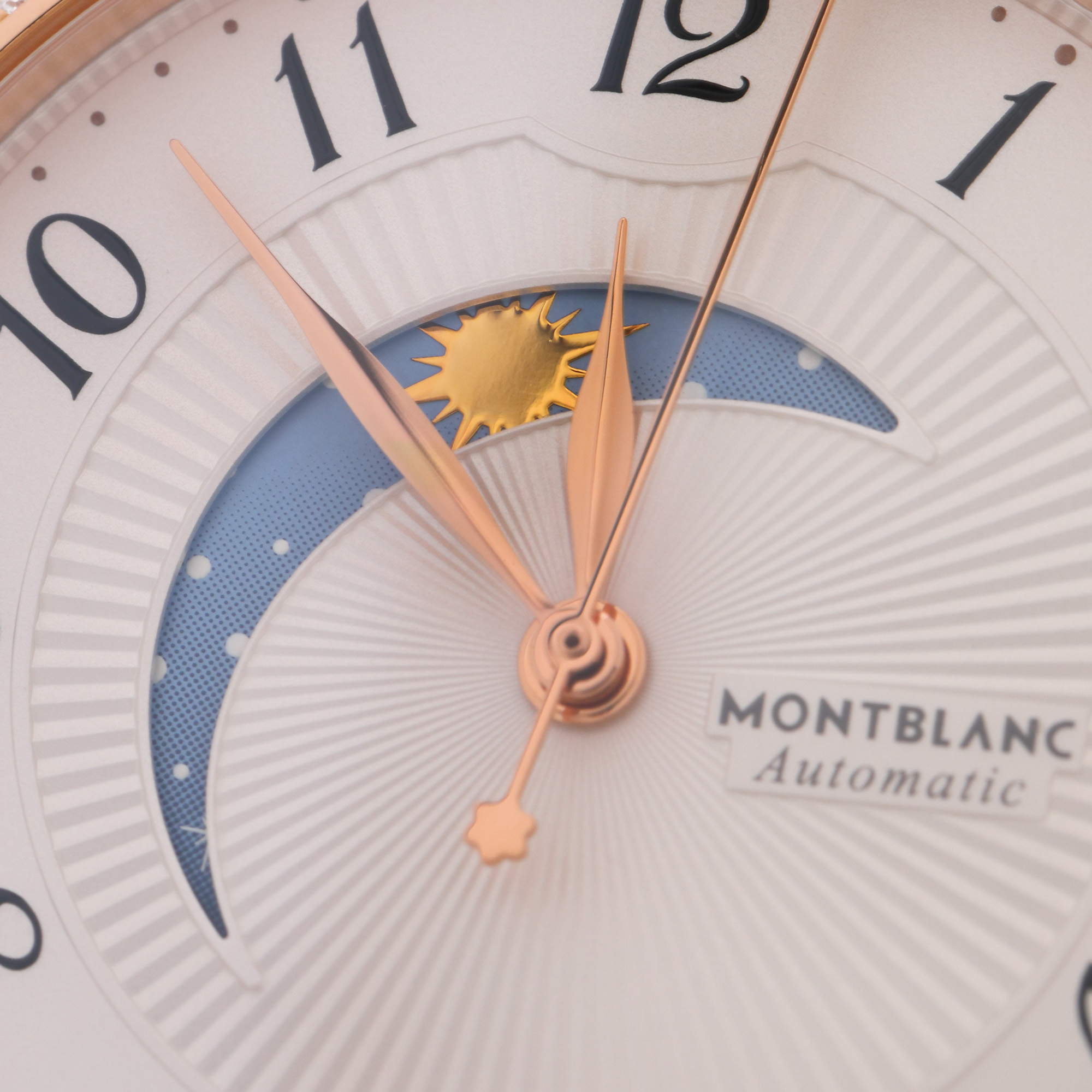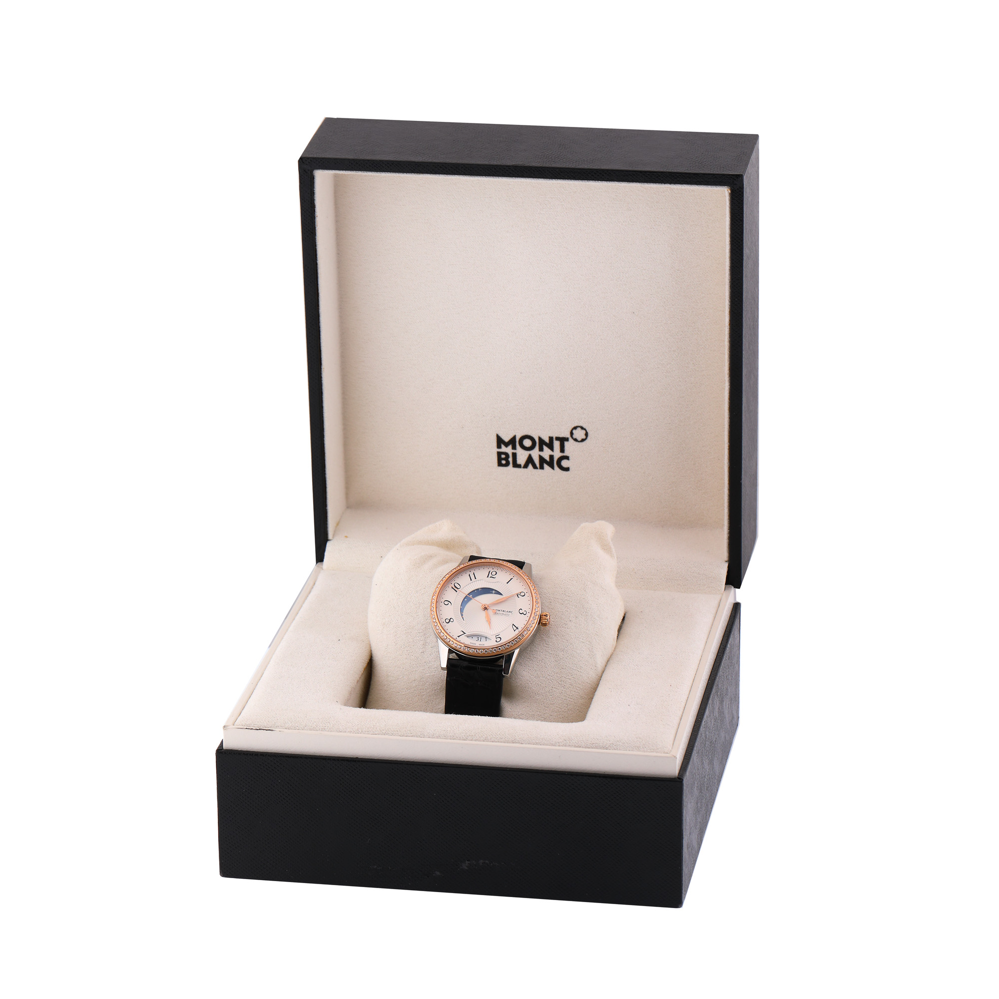 Ceas Montblanc Bohème Day & Night din aur roz, de mână, de damă, decorat cu diamante, referință 112499, mecanism automatic. Cadran de culoare crem, decorat în tehnica guilloché, numerale arabe, registru central pentru noapte/zi și registru pentru dată în dreptul orei 6. Curea din piele de aligator, de culoare neagră și cataramă din oțel, originale. Accesorii: manual de utilizare; cutie originală