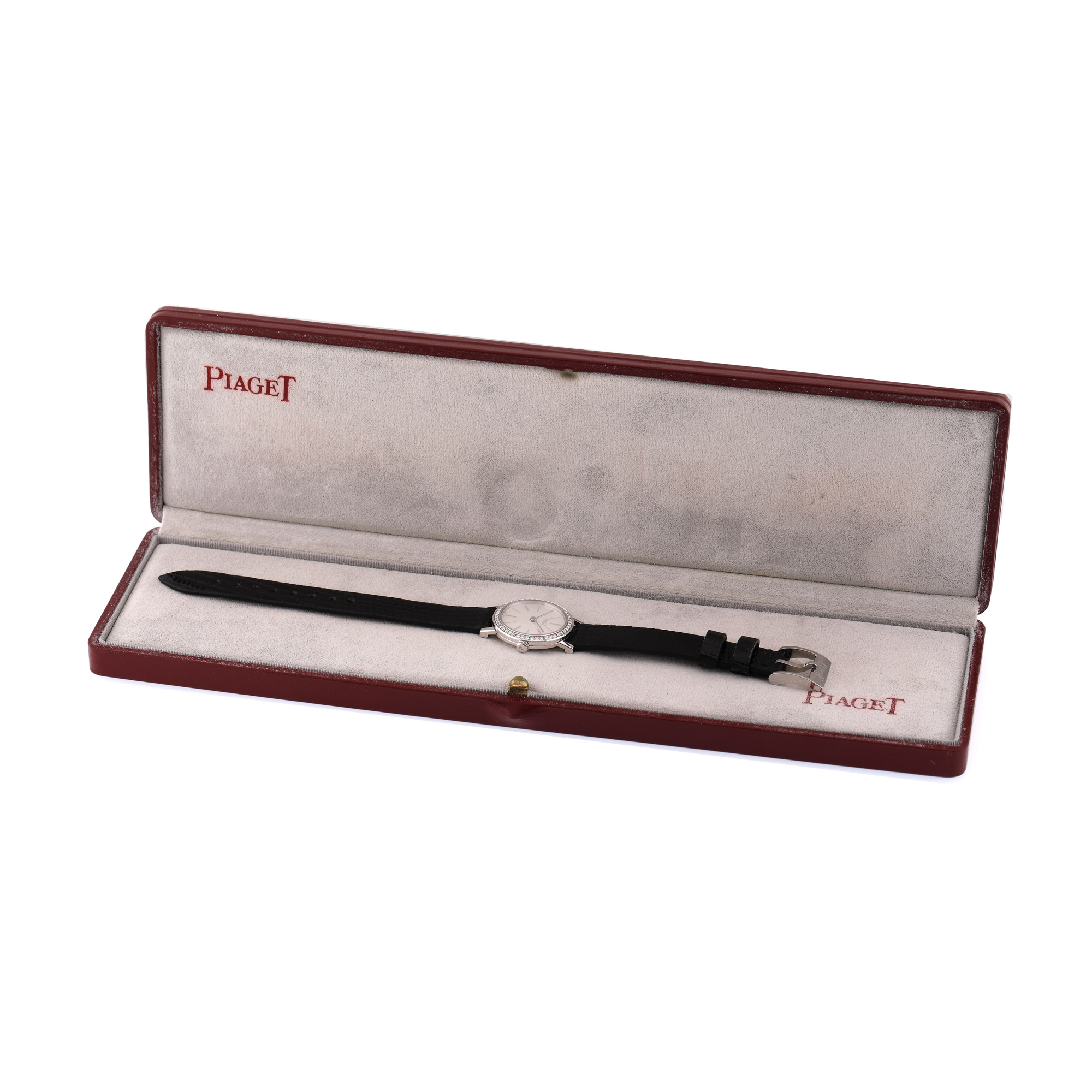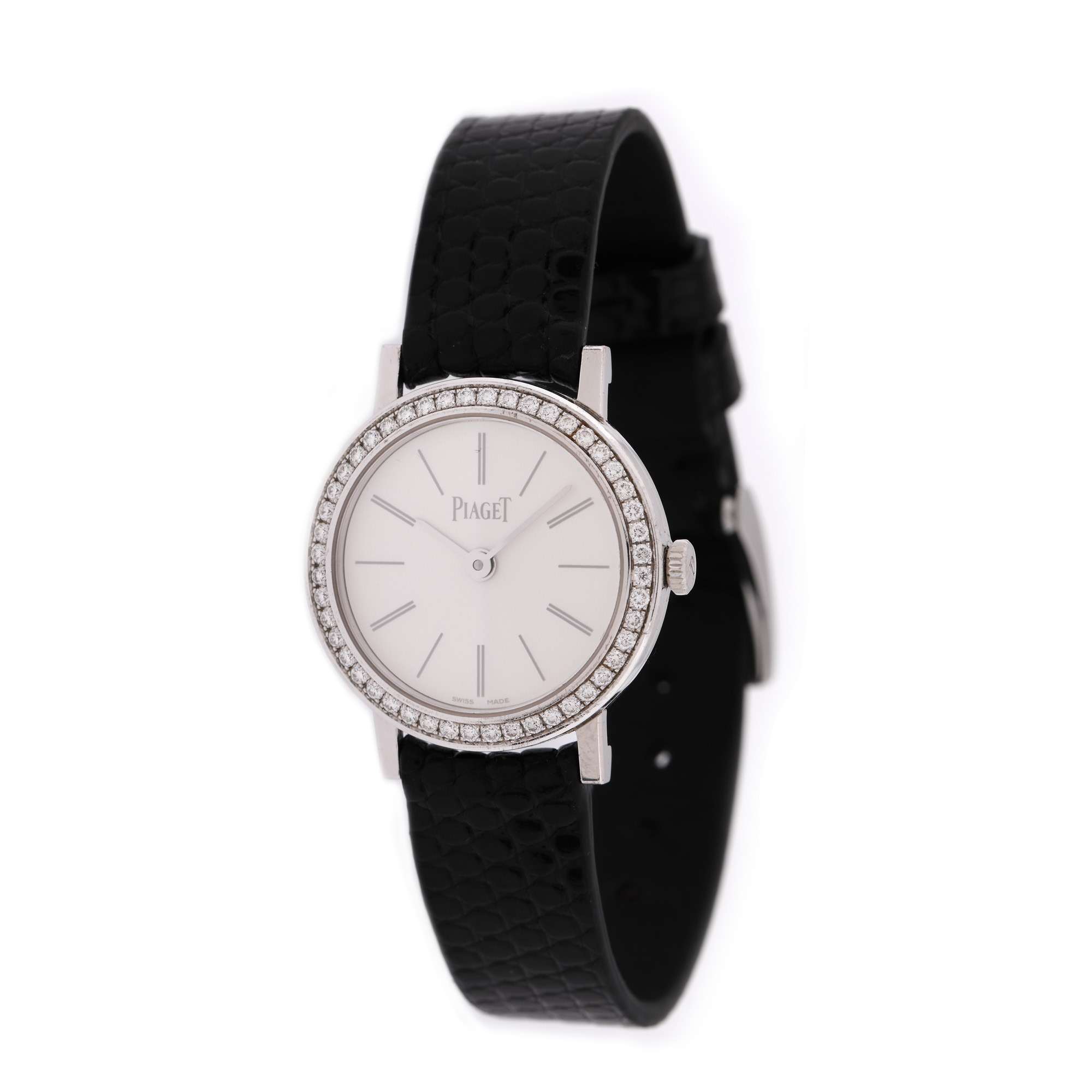 38. Ceas Piaget Altiplano Ultra-Thin din aur alb, cu bezelul ornat cu diamante, de mână, de damă, în cutie originală [Cca. 1990]