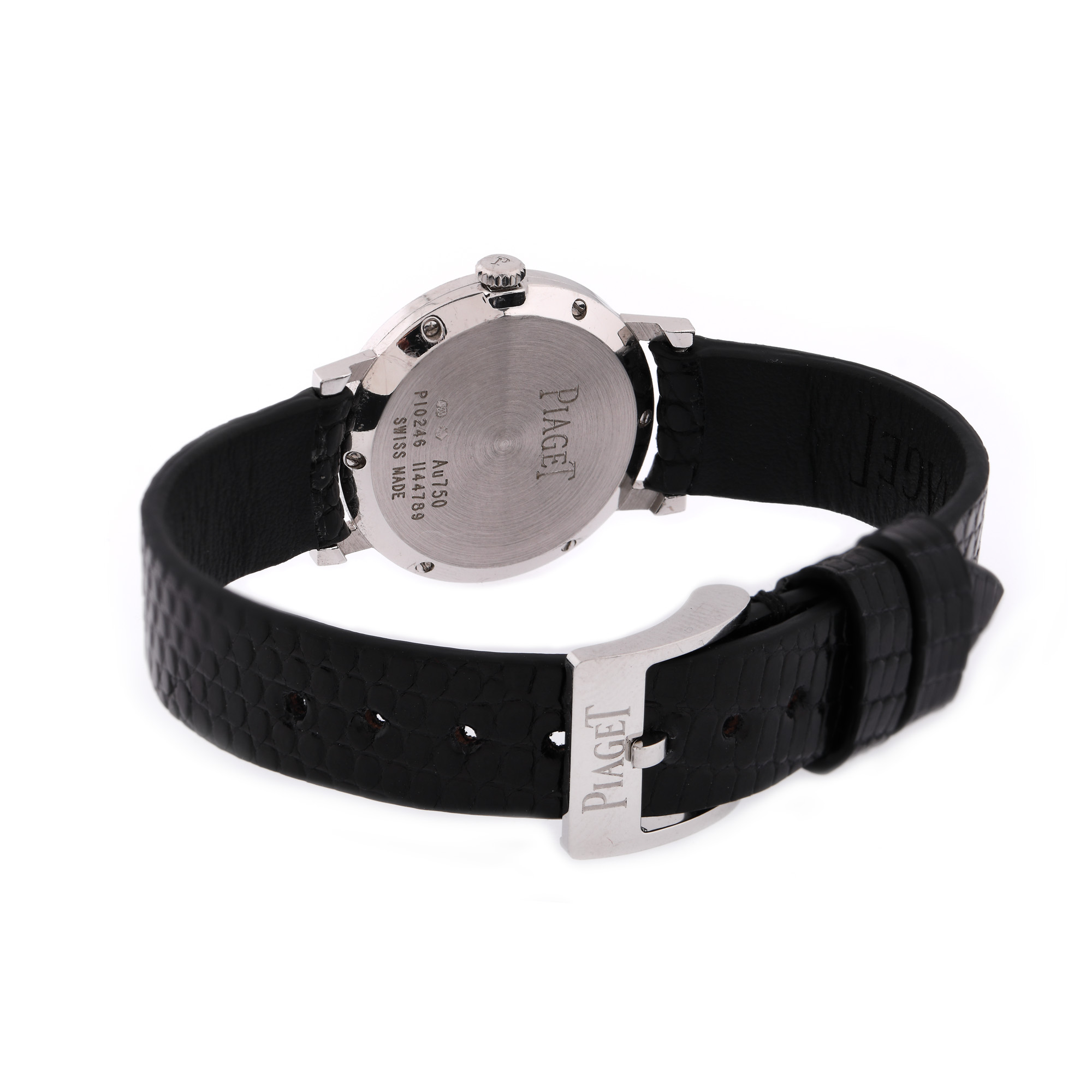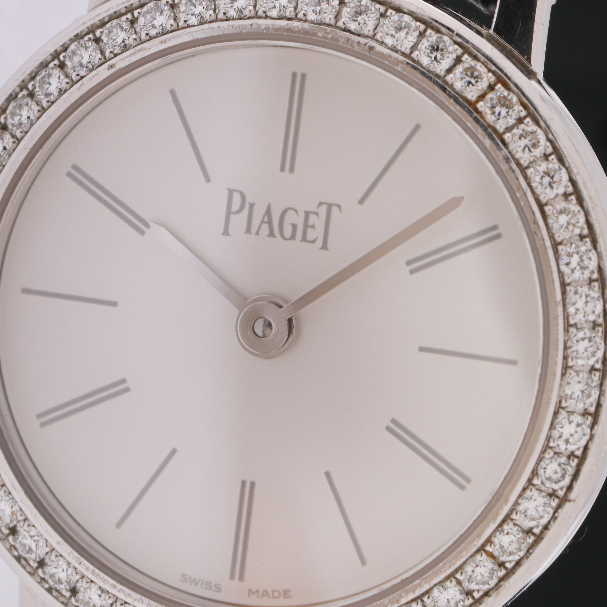 Ceas Piaget Altiplano Ultra-Thin din aur alb, de mână, de damă, în cutie originală, referință P10246, mecanism cu armare manuală. Cadran de culoare alb și bezel ornat cu diamante. Curea din piele, de culoare neagră și cataramă din oțel inoxidabil, originale. Accesorii: cutie originală.
