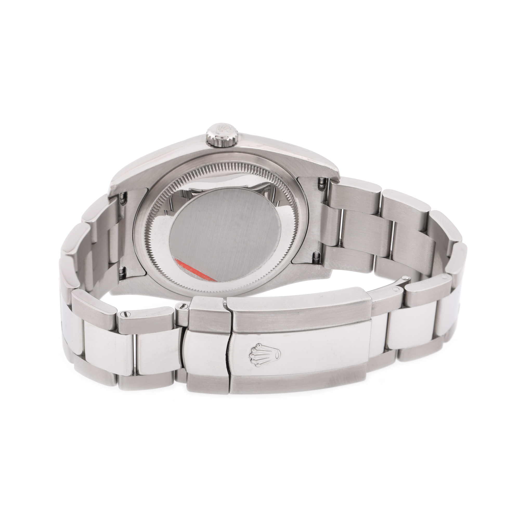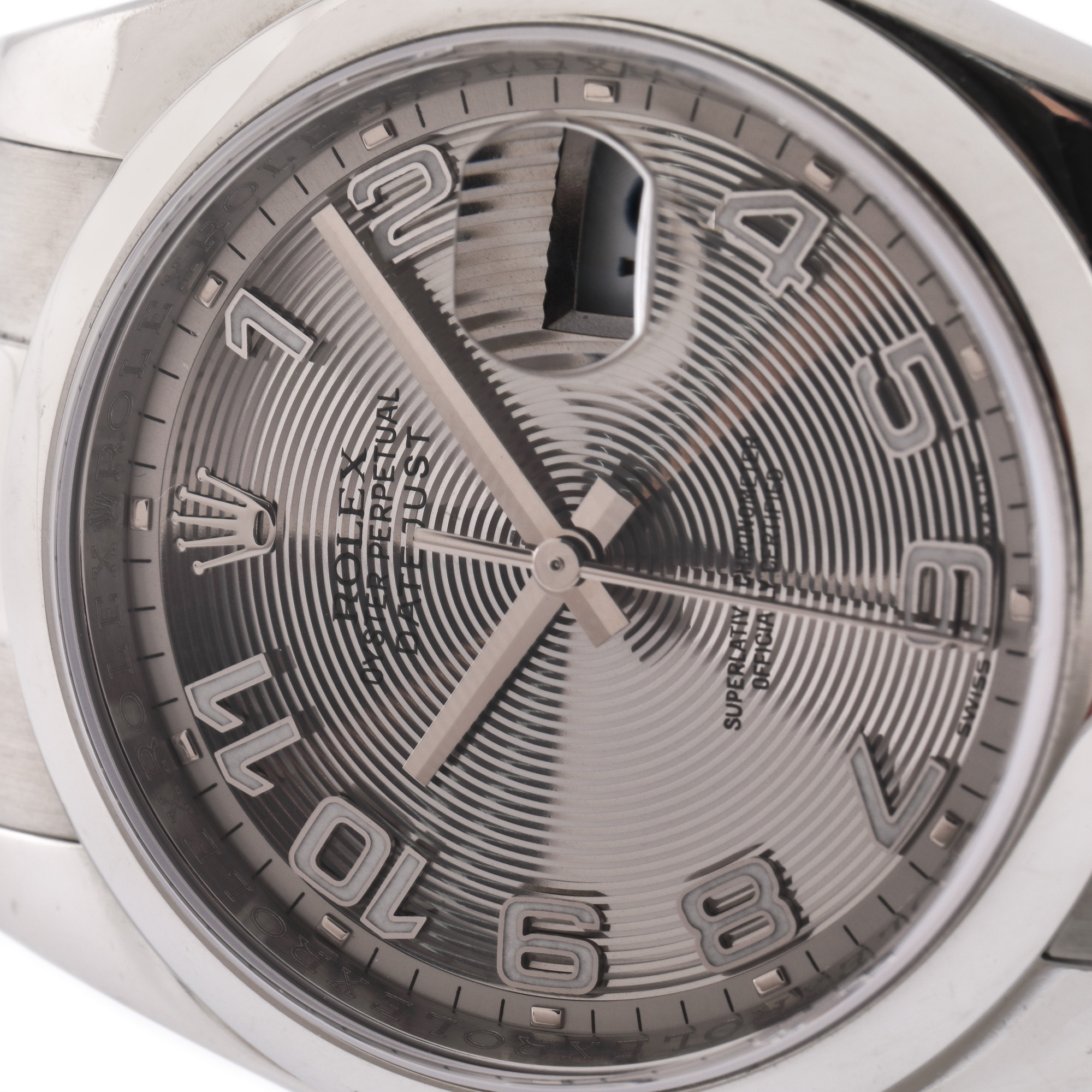 Ceas Rolex Datejust, de mână, unisex, referință 116200, mecanism automatic. Rar cadran silver, decorat cu pattern concentric, numerale arabe și registru cu lupă pentru dată, în dreptul orei 3. Brățară și sistem de închidere tip deployant, originale.
