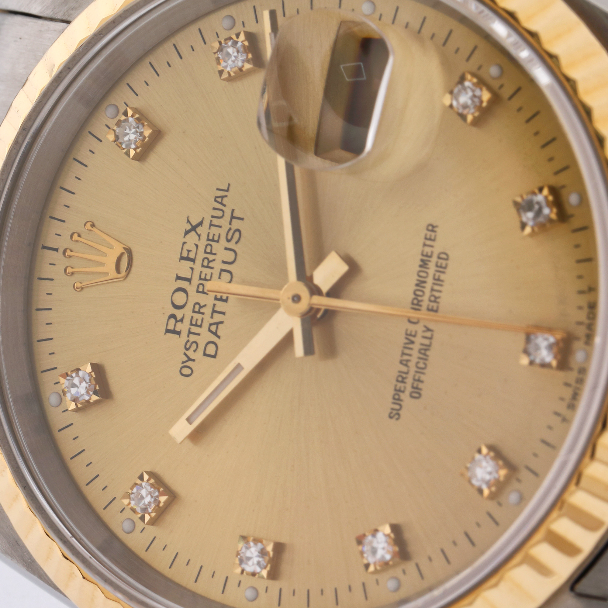 Ceas Rolex Oyster Perpetual Datejust, din aur și oțel, de mână, unisex, referință 6233, mecanism automatic. Cadran de culoare auriu, cu indici orari diamante și registru pentru dată, cu lupă, în locul orei 3. Brățară cu sistem de închidere tip deployant, originale.