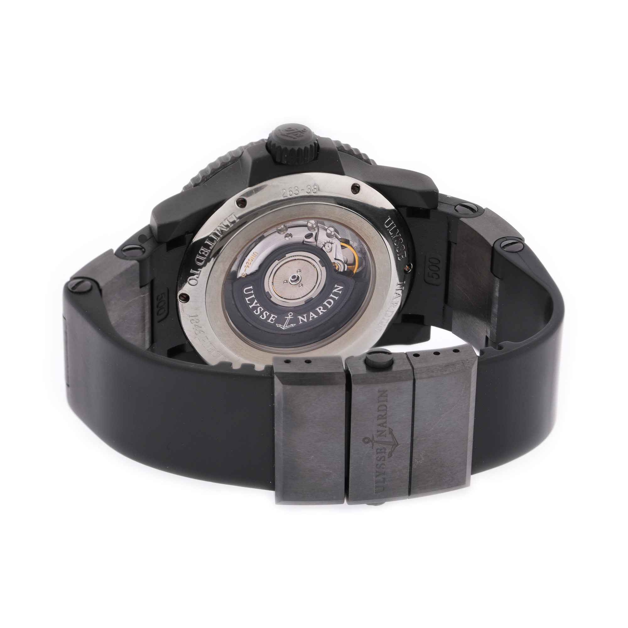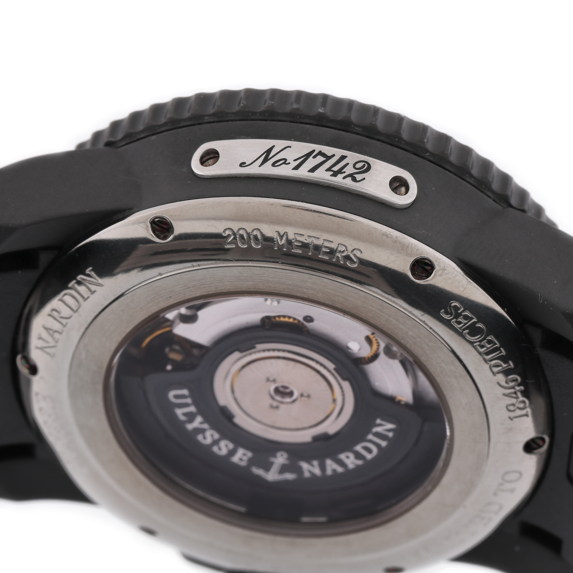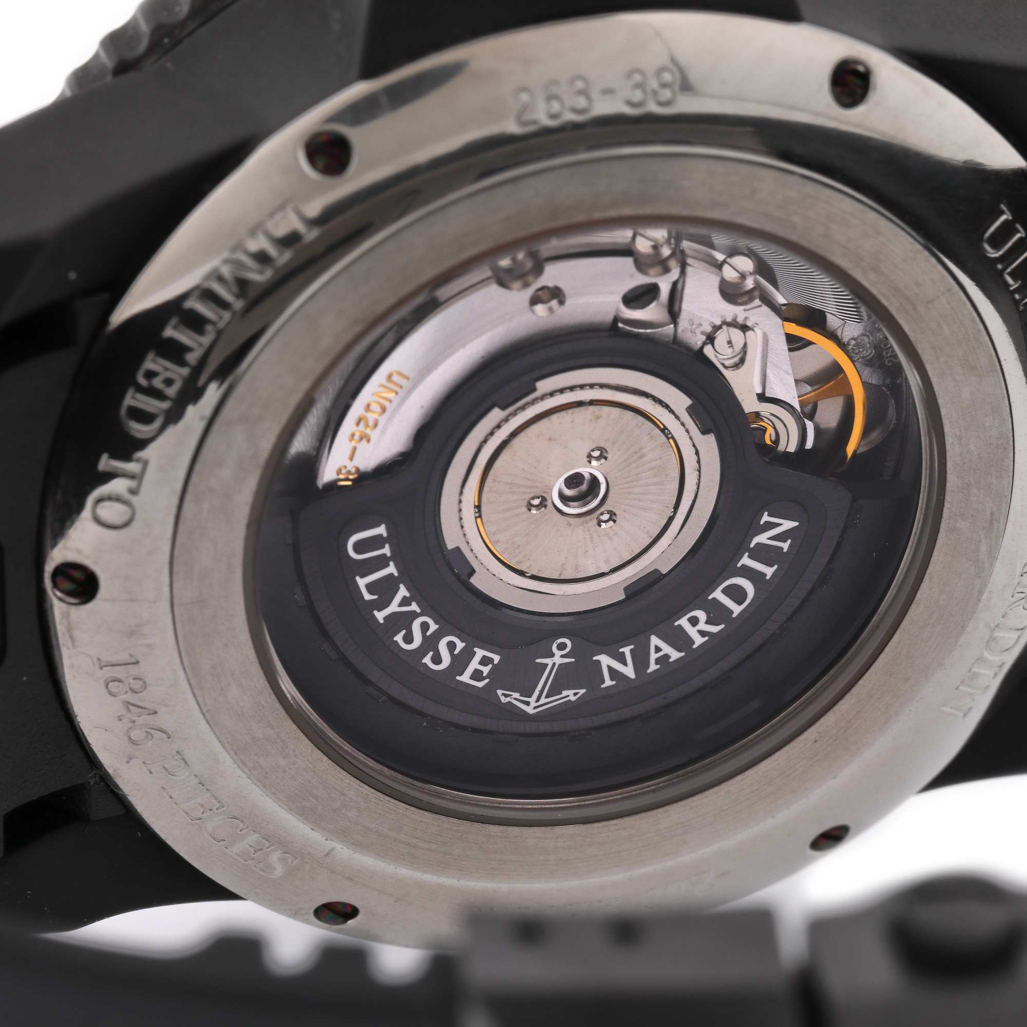 Ceas Ulysse Nardin Marine, de mână, bărbătesc, ediție limitată 1742/1846, referință 263-38, mecanism automatic, anterior vitrat. Cadran de culoare negru, decorat ”wave pattern”, două cadrane și registru pentru dată în dreptul orei 6. Curea din silicon, de culoare negru și sistem de închidere tip deployant, originale.