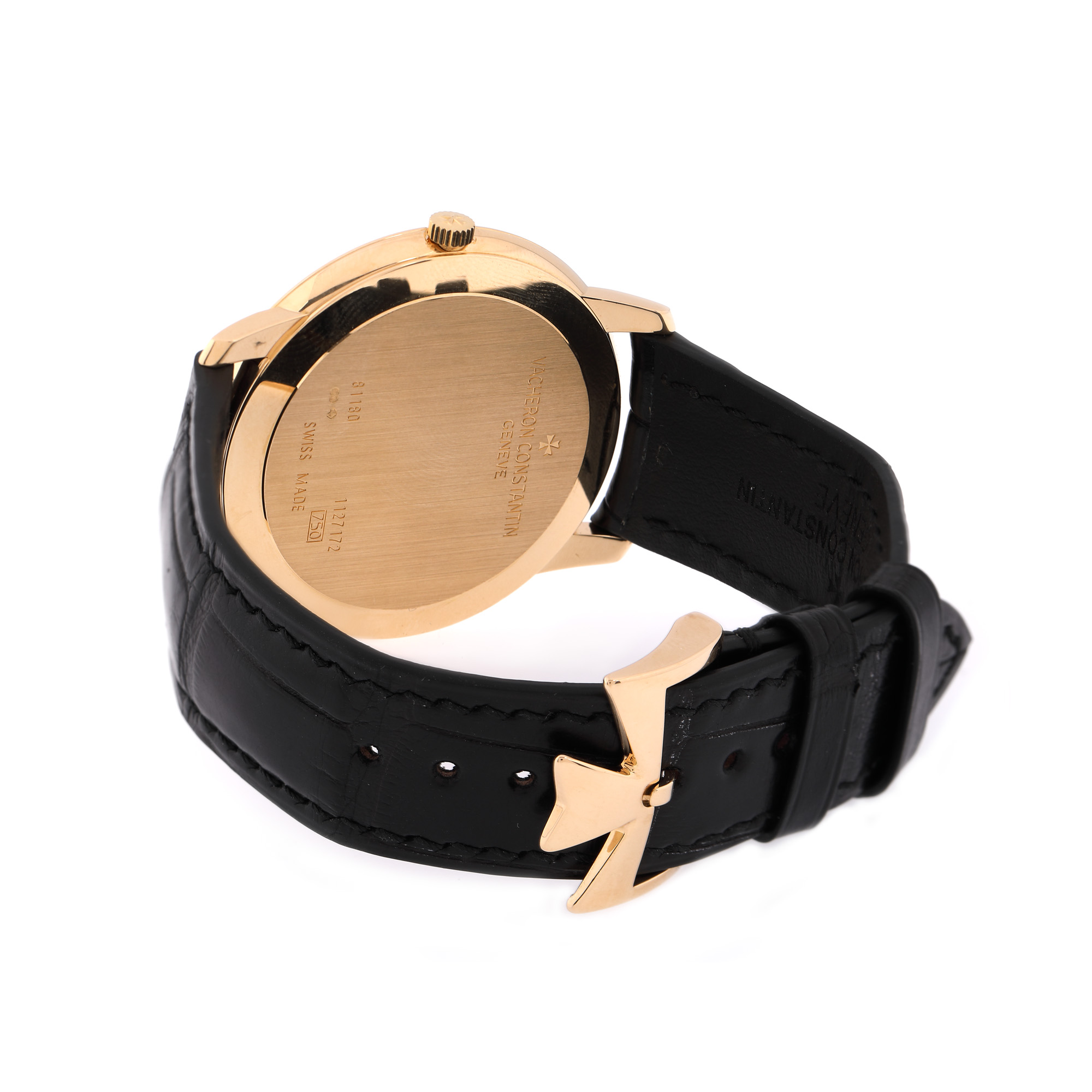 Ceas Vacheron Constantin Patrimony din aur, de mână, bărbătesc, referință 81180, mecansim cu armare manuală. Cadran de culoare crem, indici orari din aur. Curea din piele, de culoare neagră și cataramă din aur, originale. Accesorii: certificat de garanție ștampilat Ali Fardan Jewels&Precious Stones, Emirates, datat 21-02-08, nesemnat; manual de utilizare; cutie originală.