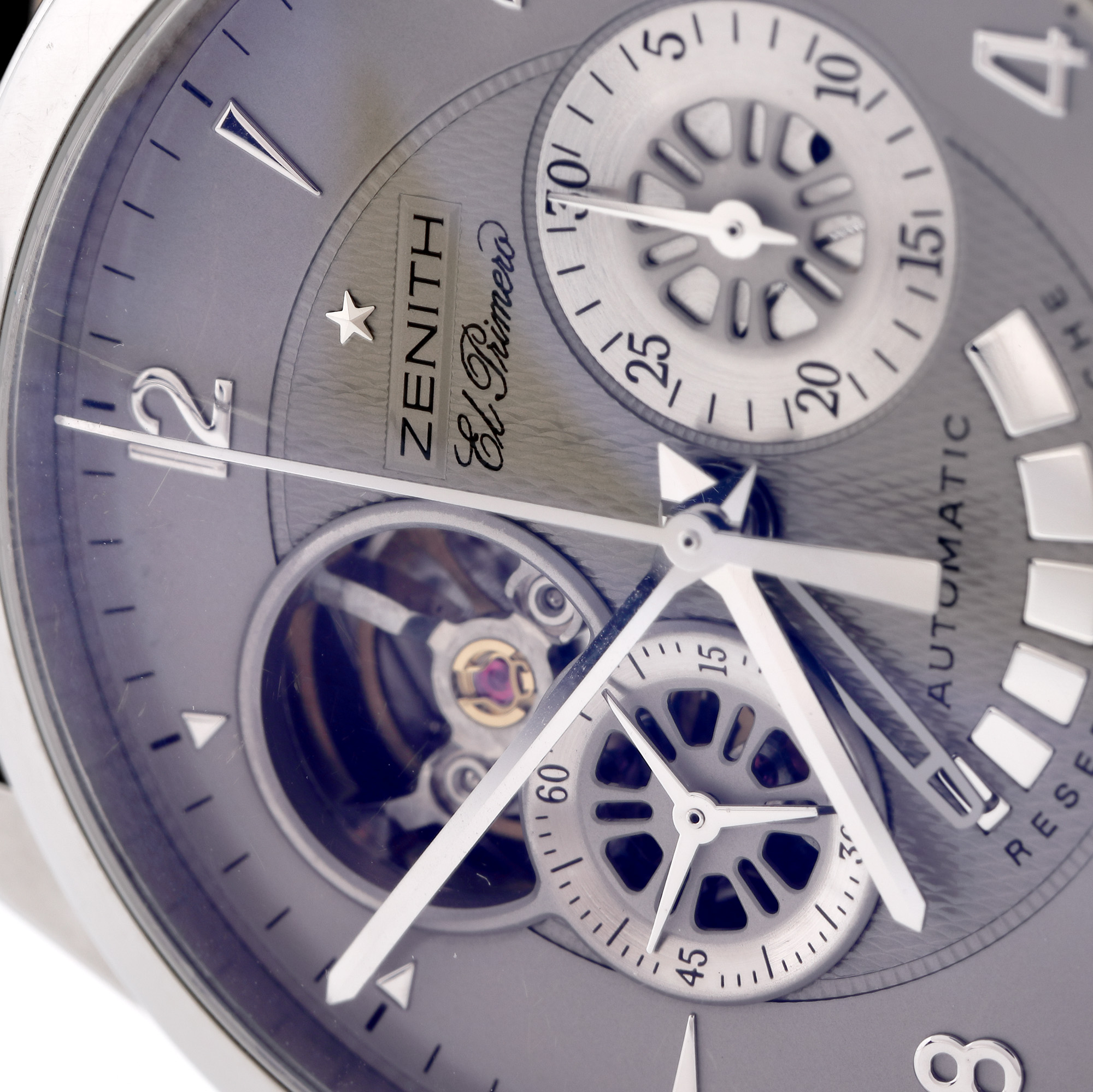 Ceas Zenith Class Open El Primero T Open, de mână, bărbătesc, referință 03.0510.4021, mecanism automatic, calibru 4021, anterior vitrat. Cadran de culoare gri, decorat central în tehnica guilloché, cu numerale arabe și indici orari din oțel, cronograf bi-compax și registru pentru rezerva de timp. Curea din piele de vițel, de culoare neagră, adăugată aftermarket și catarama din oțel, originală. Accesorii: card de garanție nedatat, nesemnat, neștampilat.