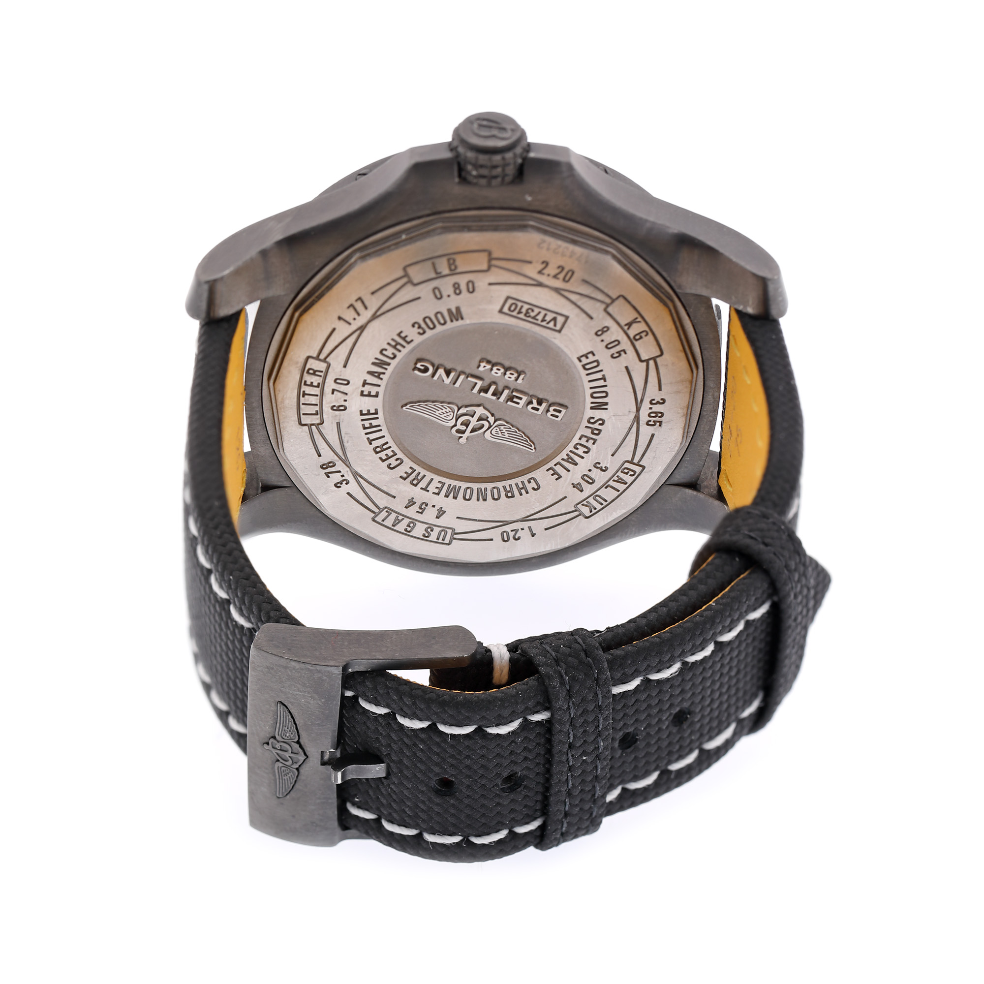 Ceas Breitling Avenger Black Bird, din titan, de mână, bărbătesc, referință V17310. Mecanism automatic, bezel rotativ unidirecțional. Cadran de culoare negru, indici baghete, registru pentru dată în dreptul orei 3. Curea originală, din piele și textil, de culoare neagră, cu sistem de încidere clasic.