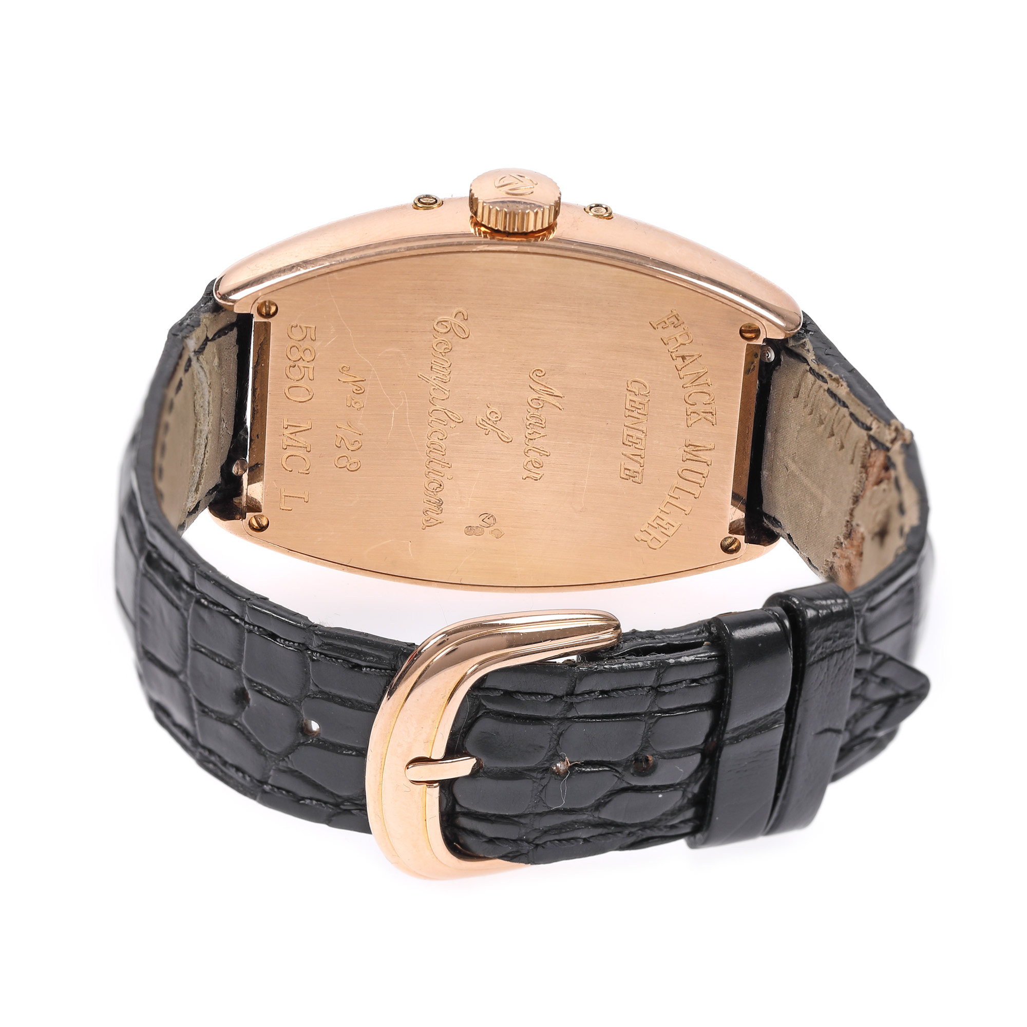 Ceas Franck Muller Master Calendar, din aur, de mână, bărbătesc, referință 6850 MC L. Mecanism automatic cu funcție de calendar și fazele lunii. Cadran de culoare ivory executat în tehnică guilloche, indici numerale arabe, registre pentru lună și ziua săptămânii în dreptul orei 12, registru pentru fazele lunii în dreptul orei 6, cu data afișată retrograd. Curea originală, din piele, de culoare neagră, cu sistem de închidere clasic, cu catarama originală din aur.