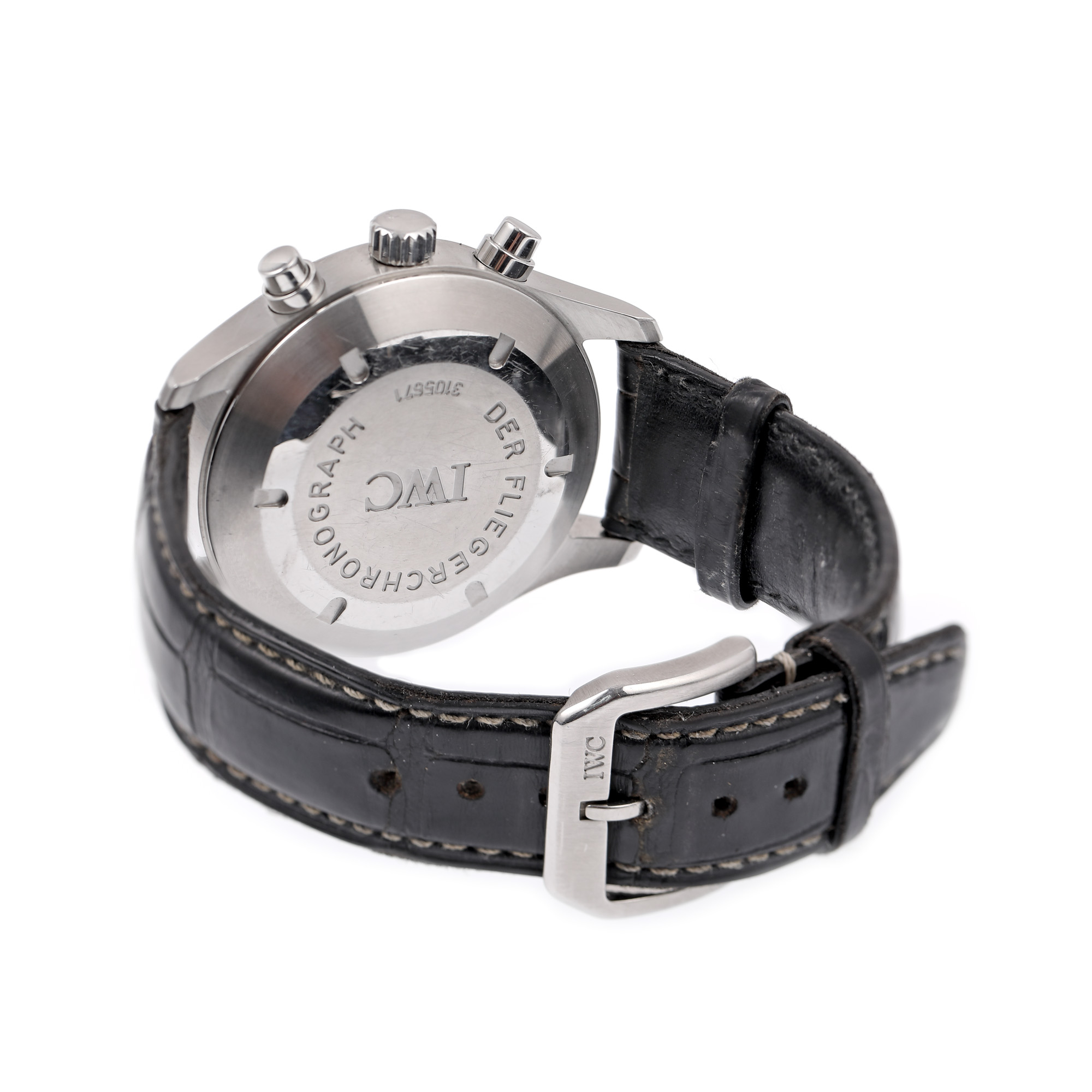 Ceas IWC Pilot Chronograph, de mână, bărbătesc IW370613. Mecanism automatic, cu funcție de chronograph, calibrul 82100. Cadran de culoare negru, indici cu numerale arabe, cu un registru dublu pentru dată în dreptul orei 3, un registru pentru secundar în dreptul orei 9 și două registre pentru funcția de chronograph în dreptul orelor 6 și 12. Curea originală, din piele de crocodil, de culoare neagră, cu sistem de închidere clasic, cu catarama originală.