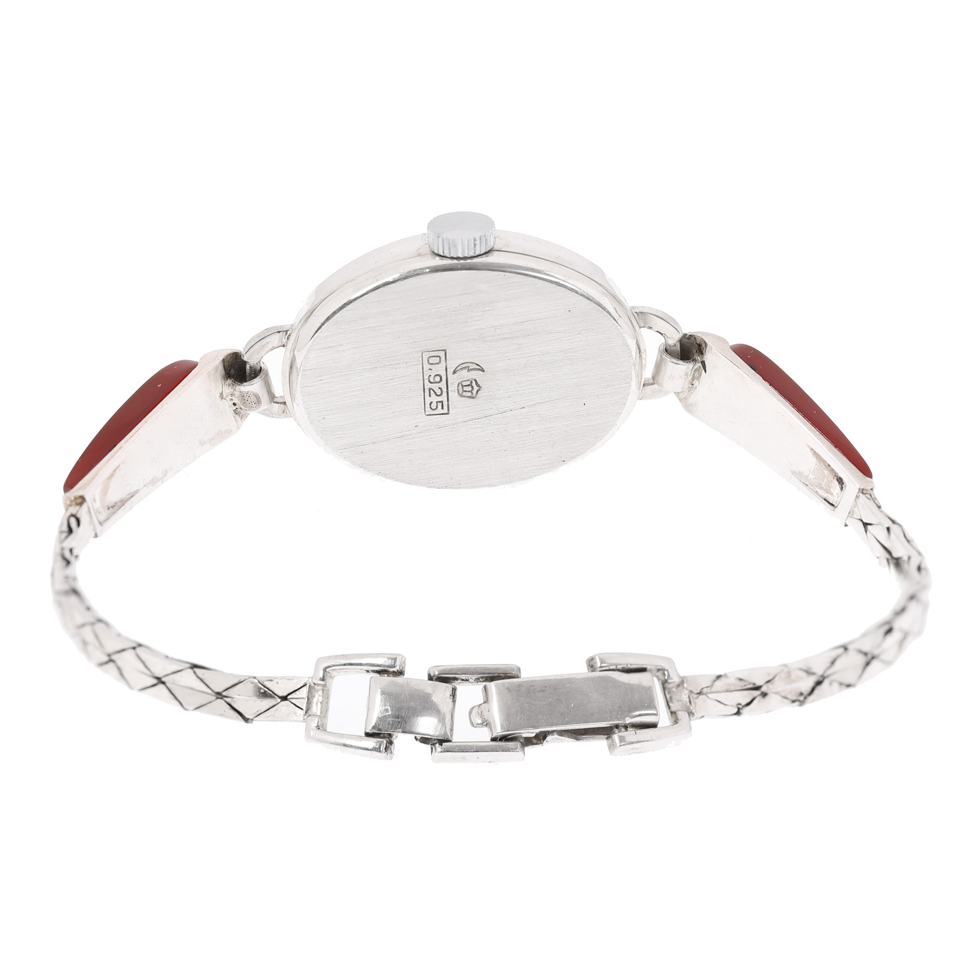 Ceas Junghans, din argint, decorat cu corali, de mână, de damă. Mecanism cu armare manuală. Cadran de culoare roșu, indici baghete. Brățara originală, din argint, cu sistem de închidere cu clemă.
