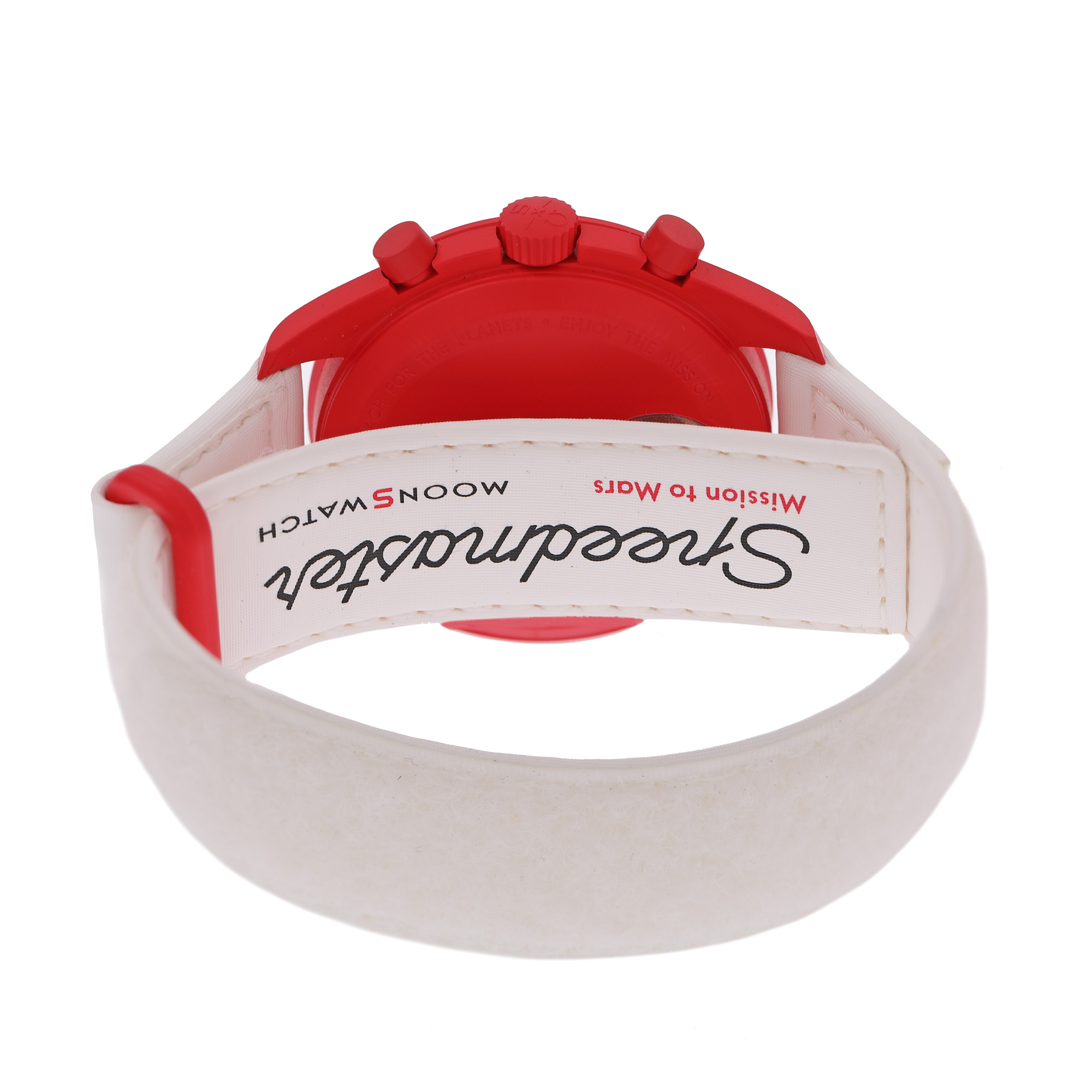 Ceas Omega Swatch MoonSwatch Mission to Mars, de mână, unisex, nou, referință SO33R100. Mecanism quartz, cu funcție chronograph. Cadran de culoare alb, indici baghete, cu două registre pentru chronograph în dreptul orelor 2 și 10, cu registru pentru secundar în dreptul orei 6. Curea originală, din pânză, de culoare albă, cu sistem de închidere cu velcro. Accesorii: cutia originală, card de garanție.