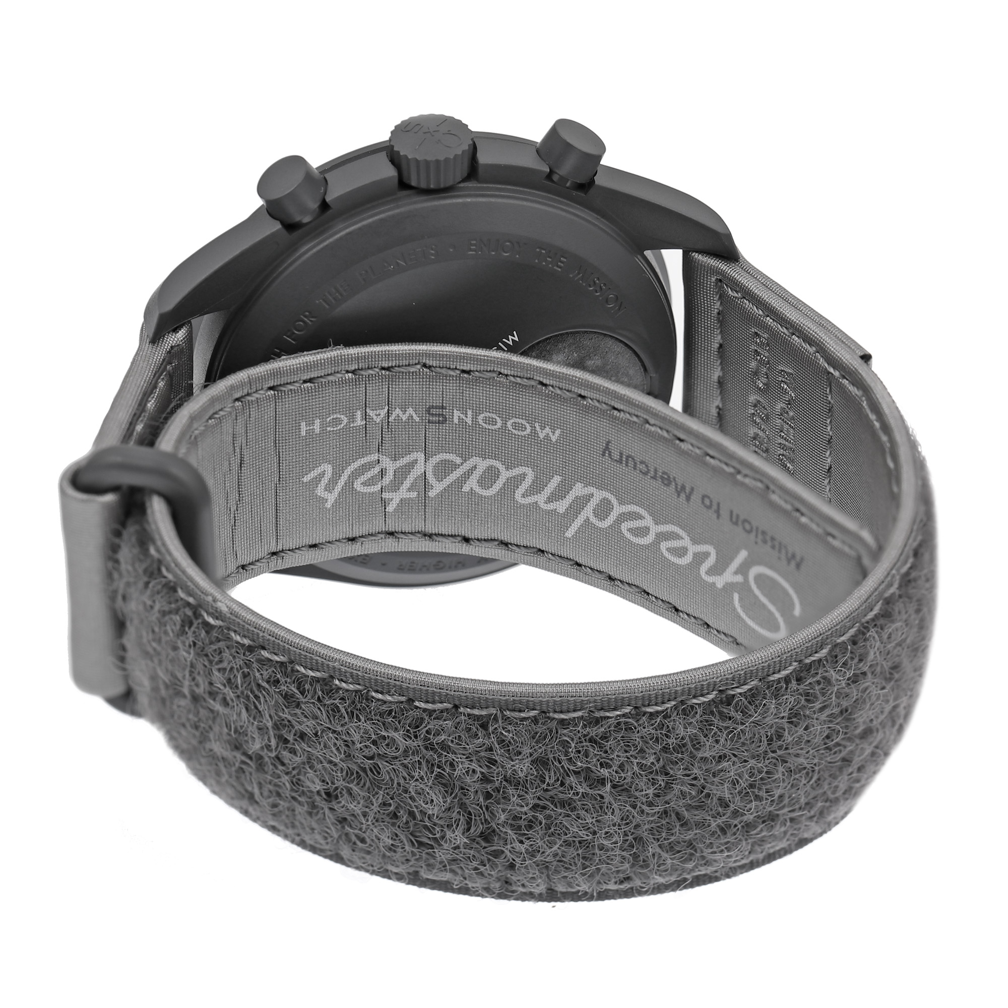 Ceas Omega Swatch MoonSwatch Mission to Mercury, de mână, unisex, nou, referință SO33A100. Mecanism quartz, cu funcție chronograph. Cadran de culoare gri închis, indici baghete, cu două registre pentru chronograph în dreptul orelor 2 și 10, cu registru pentru secundar în dreptul orei 6. Curea originală, din pânză, de culoare gri, cu sistem de închidere cu velcro. Accesorii: cutia originală, card de garanție.