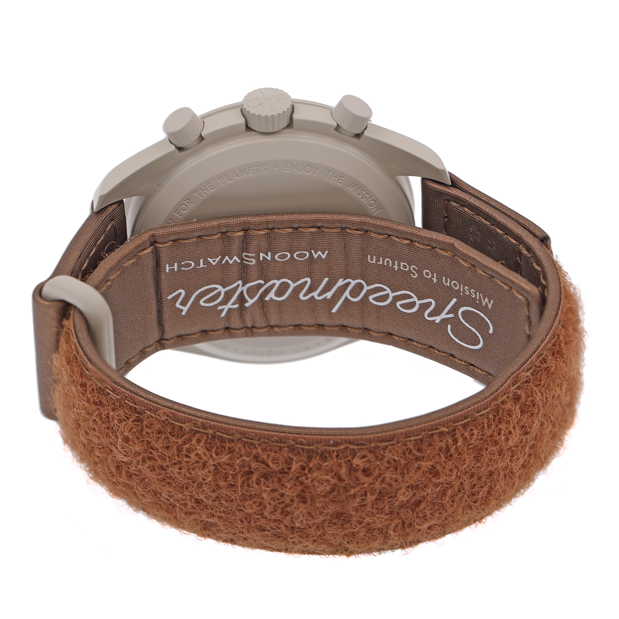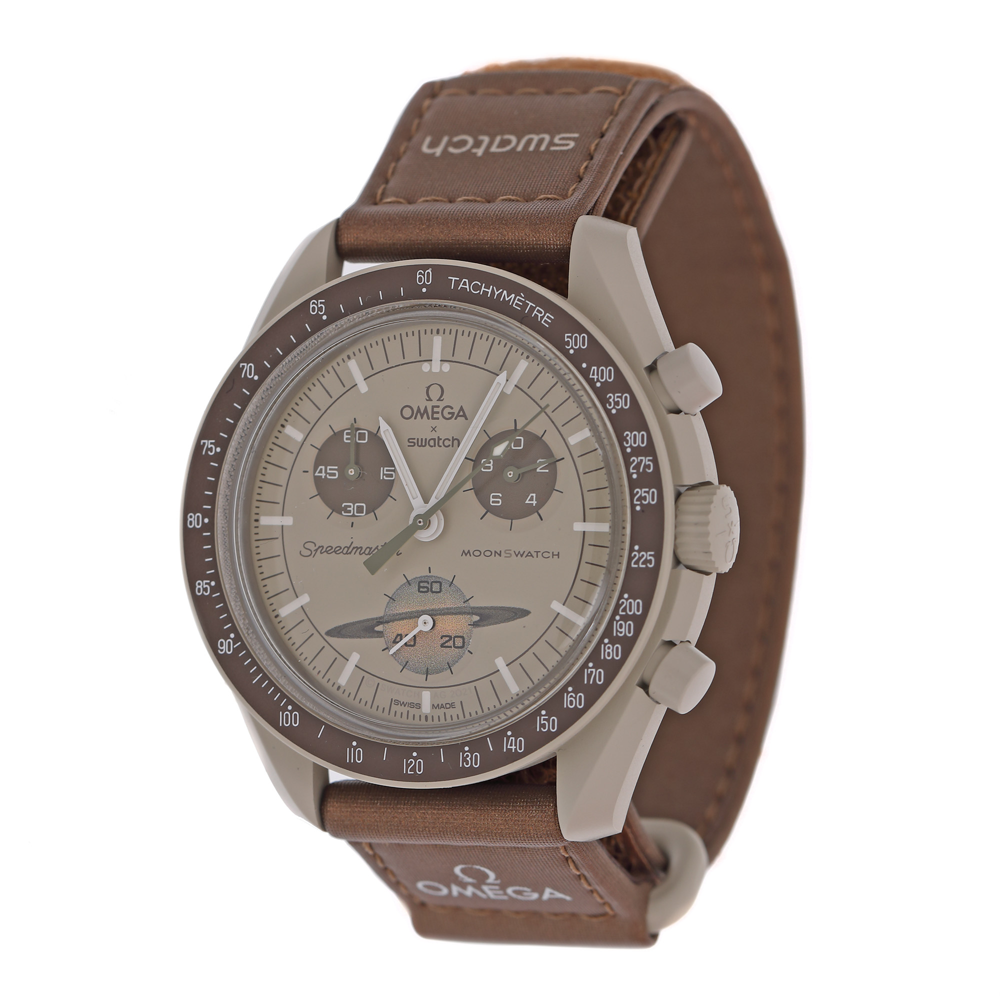 Ceas Omega Swatch MoonSwatch Mission to Saturn, de mână, unisex, nou, referință SO33T100. Mecanism quartz, cu funcție chronograph. Cadran de culoare crem, indici baghete, cu două registre pentru chronograph în dreptul orelor 2 și 10, cu registru pentru secundar în dreptul orei 6. Curea originală, din pânză, de culoare maro, cu sistem de închidere cu velcro. Accesorii: cutia originală, card de garanție.