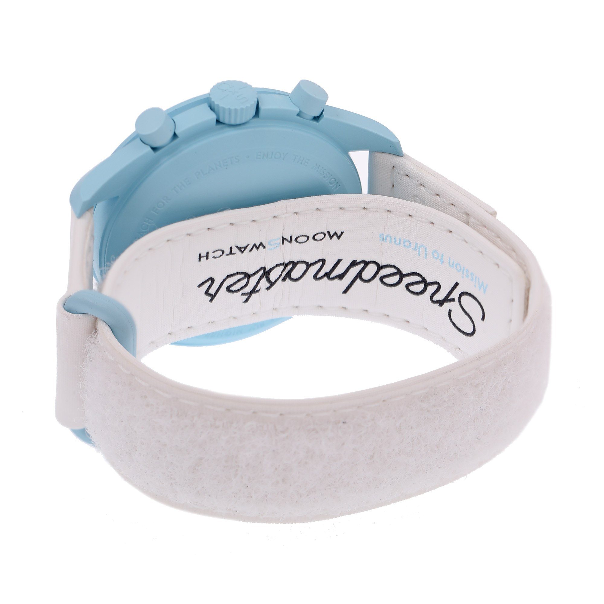 Ceas Omega Swatch MoonSwatch Mission to Uranus, de mână, unisex, nou, referință SO33L100. Mecanism quartz, cu funcție chronograph. Cadran de culoare albastru deschis, indici baghete, cu două registre pentru chronograph în dreptul orelor 2 și 10, cu registru pentru secundar în dreptul orei 6. Curea originală, din pânză, de culoare albă, cu sistem de închidere cu velcro. Accesorii: cutia originală, card de garanție.