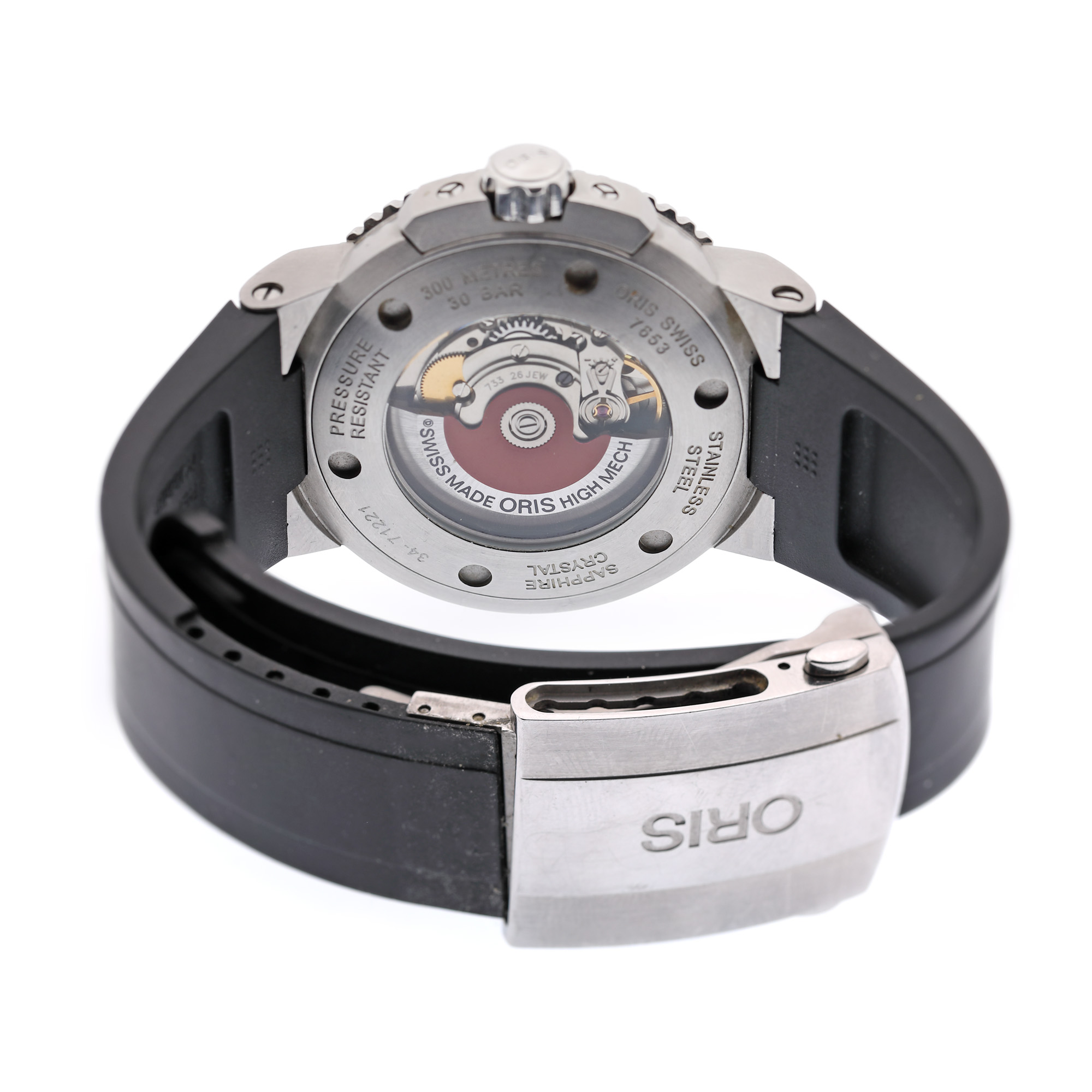Ceas Oris Aquis Date, de mână, bărbătesc, referință 01 733 7730. Mecanism automatic, calibrul 733. Bezel rotativ, unidirecțional. Cadran de culoare bleumarin, indici baghetă, cu un registru pentru dată în dreptul orei 6. Curea originală, din cauciuc, de culoare neagră, cu sistem de închidere de tip deployant.