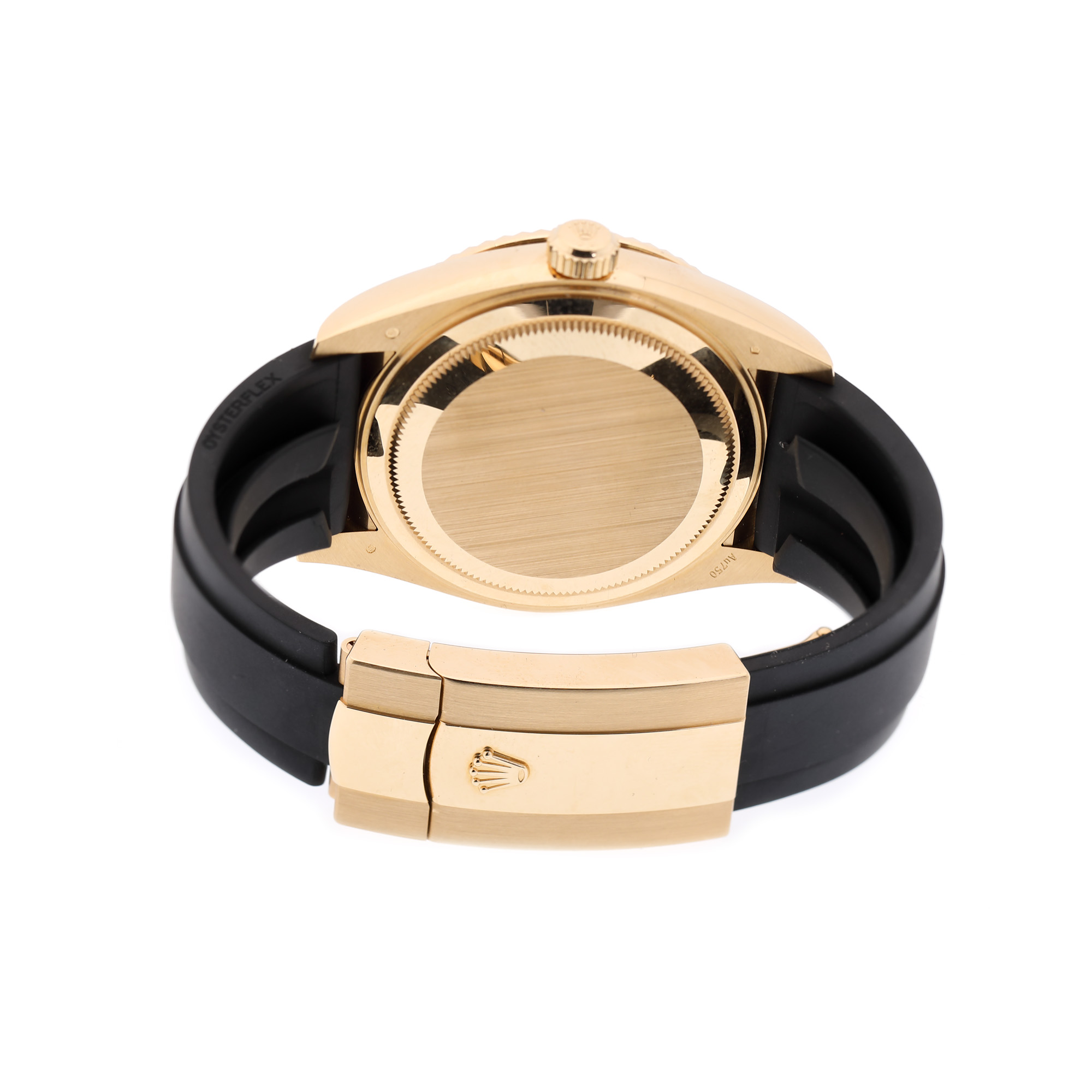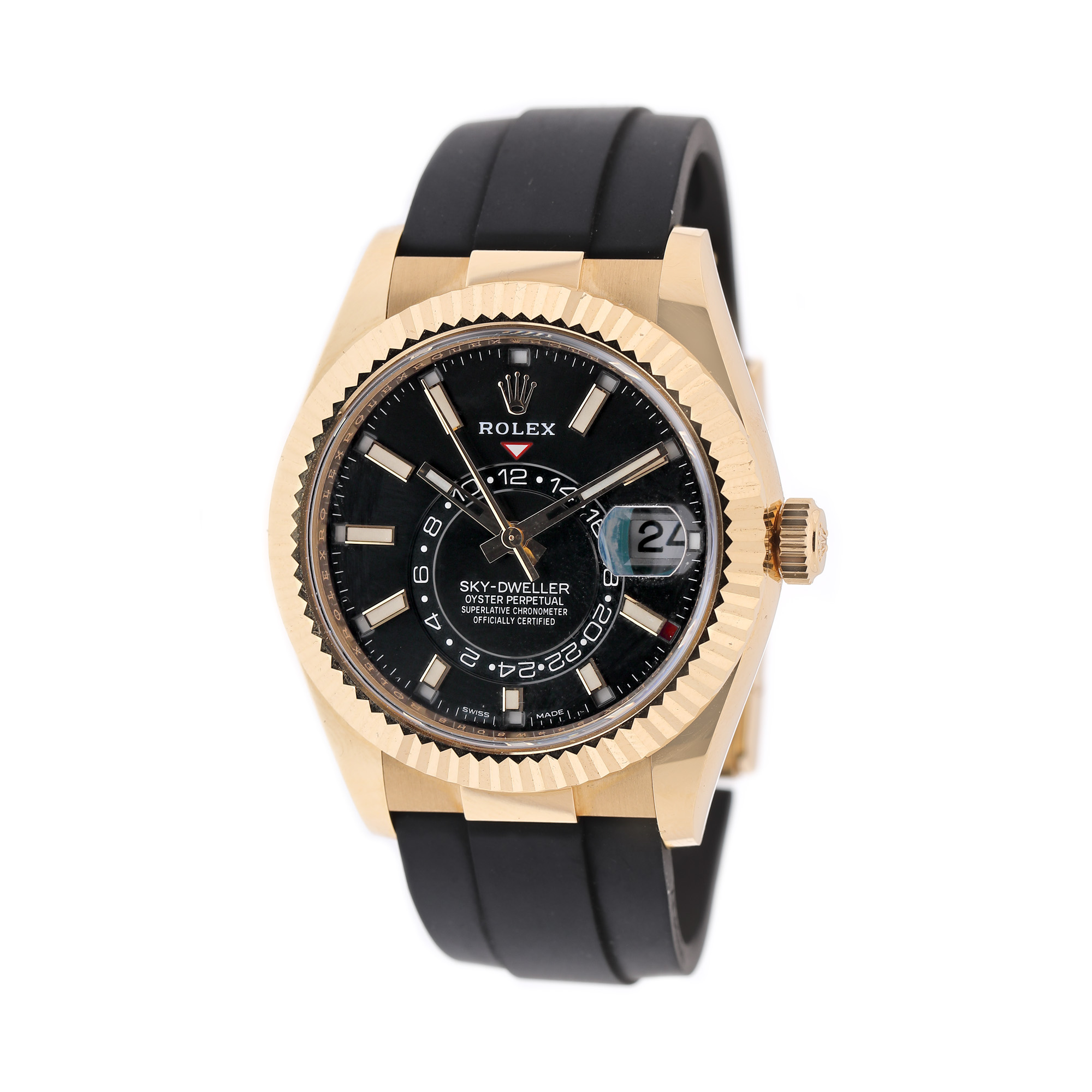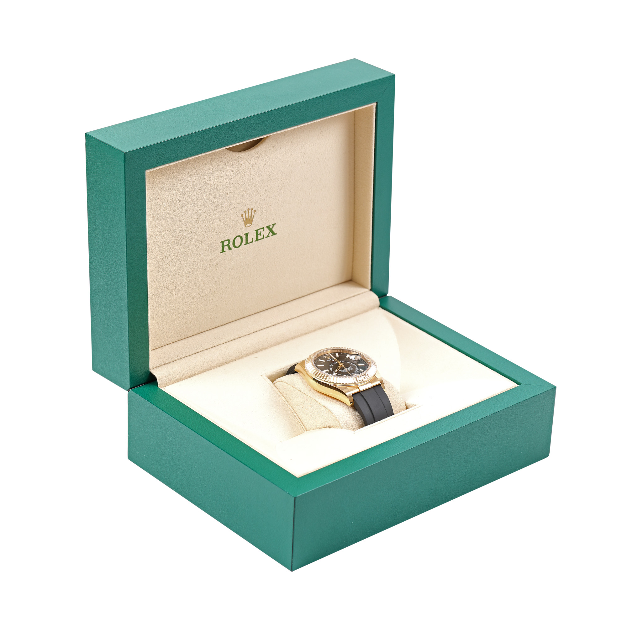 Ceas Rolex Skydweller, din aur, de mână, bărbătesc, referință 326238. Mecanism automatic, cu funcție de GMT și calendar anual, 40 de rubine și 72 de ore de autonomie, calibrul 9001. Cadran de culoare negru, indici baghetă, cu un registru pentru funcția de gmt în centrul cadranului și un registru pentru dată în dreptul orei 3. Curea originală oysterflex, din cauciuc, de culoare neagră, cu sistem de închidere de tip deployant. Accesorii: cutie, acte de proveniență.