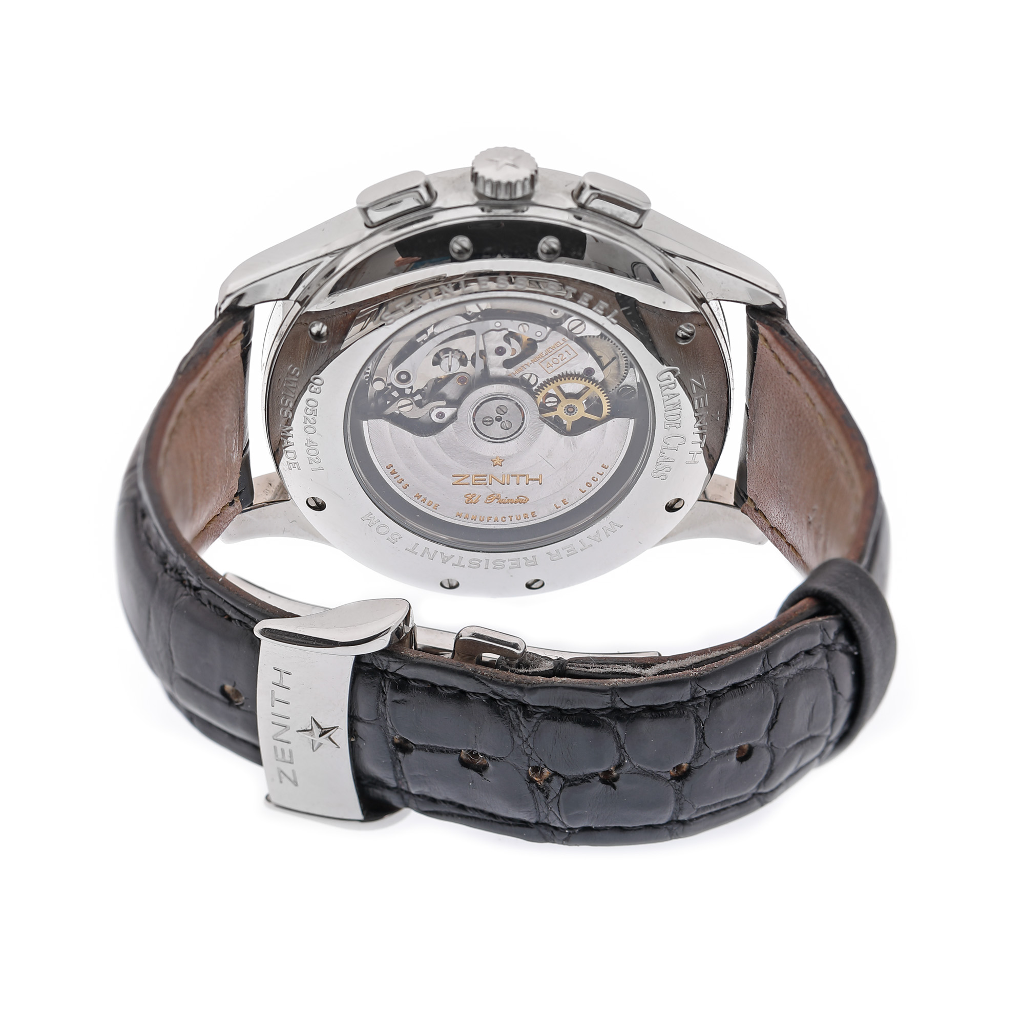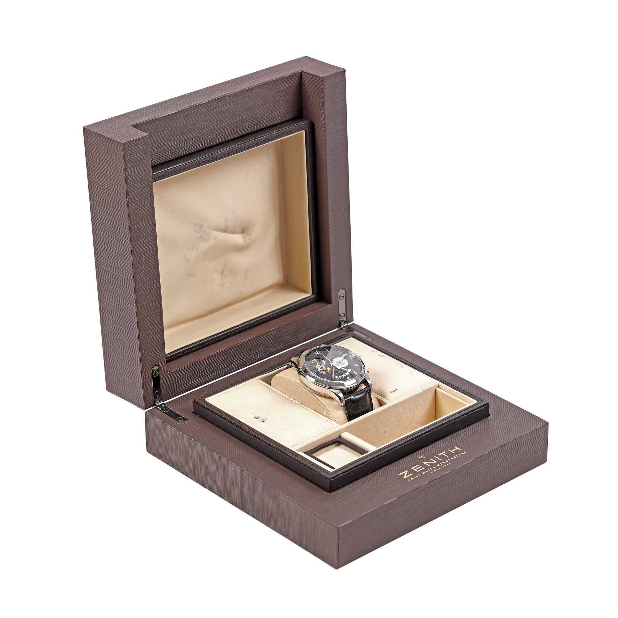 Ceas Zenith El Primero, de mână, bărbătesc, în cutia originală. Mecanism automatic cu funcție de chronograph. Cadran de culoare negru, indici cu numerale arabe, cu registrul pentru secundar în dreptul orei 9, un registru pentru funcția de chronograph în dreptul orei 3 și afișaj pentru autonomia mecanismului în dreptul orei 6. Curea originală din piele, de culoare neagră, cu sistem de închidere de tip deployant. Accesorii: cutia originală.