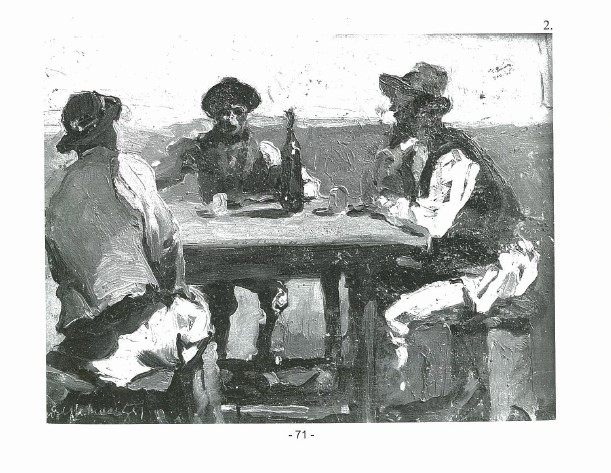 Abordând tematici și subiecte cu o încărcătură profund umanistă, Rudolf Schweitzer-Cumpăna se înscrie în istoria artelor vizuale românești drept un veritabil zugrav al satului și al țăranului autohton. Copilăria petrecută în mijlocul naturii, în atmosfera rustică de la Cumpăna, se va traduce printr-un studiu asiduu al vieții sătenilor argeșeni. Artistul va transcrie chipuri, porturi, gesturi și obiceiuri într-o serie de fresce dedicate spațiului rural. Printre tematicile sale de suflet se numără maternitatea, munca și grija față de gospodărie sau muncile casnice, transcrise în peisaje, portrete sau scene de gen. Nu idilizează imaginea țăranului, ci prezintă omul simplu, obișnuit, cu frământările sale sufletești și preocupările cotidiene. Dramatismul expresivității cromatice a artistului e accentuat de viziunea sa realistă. Solemnitatea gesturilor și nuanțele pământii se succed în opere precum ”Țărani la masă”, ”Prânz țărănesc” ori chiar în cazul lucrării de față. Artistul posedă o sensibilitate deosebită și o remarcabilă putere de înțelegere a psihologiei umane astfel că adună, și de această dată, câteva personaje în jurul unei mese. Avem parte de o perspectivă directă asupra chipului violonistului, putem privi alte două personaje din profil, în timp ce al patrulea personaj a fost schițat cu spatele. Redați în porturi tradiționale, cu ii și brâuri, cei trei țărani sunt așezați pe scaune, în jurul mesei, în timp ce muzicantul, singurul personaj surprins frontal, e ilustrat în timp ce cântă la vioară. Arcușul său atinge corzile instrumentului muzical în timp ce sticla de vin, plasată strategic în partea stângă a mesei, ne dezvăluie preocupările personajelor din clipele de răgaz. Păstrând tradiția ciclului său tematic preferat, artistul ne invită să pătrundem, și de această dată, în tainele lumii tradiționale.