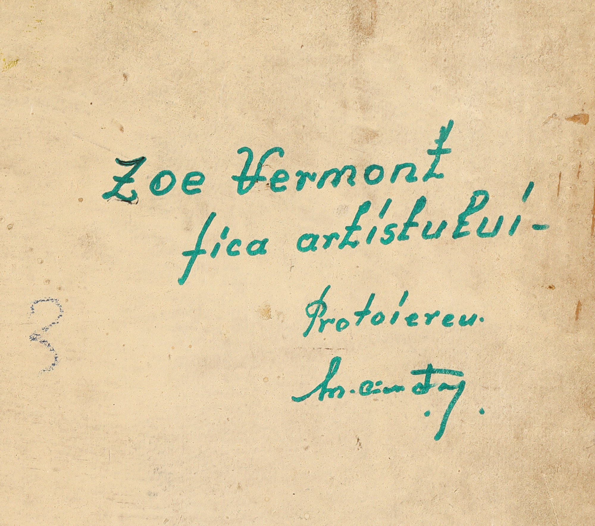 Orientându-se către propria familie pentru găsirea surselor de inspirație, Nicolae Vermont le va conferi fiicei și soției sale rolul de muze în creația sa. Micuța Zoe Vermont se naște în anul 1911 și devine subiect central al pânzelor tatălui său. Schițată frugal, în creion; ori studiată îndeaproape în ulei, Zoe Vermont ni se va înfățișa frecvent în ipostaze de maximă concentrare, de melancolie ori reverie. Dragostea și grija paternă se vor manifesta, așadar, în permutarea peniței și a pensulelor lui Nicolae Vermont către ridicarea chipului fiicei la rang de laitmotiv. Zoe Vermont va moșteni ambiția plastică a tatălui și va deveni, la rândul său, artistă. Se va manifesta îndeosebi în grafică și desen și se va îndeletnici cu redarea peisajelor și a portretelor. Va fi prezentă pe simezele manifestărilor artistice ale Salonului Oficial de la mijlocul secolului trecut, ajungând astfel în fața publicului și în postura de creatoare, nu doar din cea de model. Le vom regăsi adesea pe cele două muze ale artistului redate împreună – mamă și fiică - stând alături pe verandă, cufundate în lectură ori surprinse în timpul activităților domestice. De această dată, însă, Zoe Vermont devine personajul central al unui portret în care predomină nuanțele pământii. O avem în față acum pe fiica ajunsă la maturitate, cu trăsături bine conturate, cu o atitudine încrezătoare și o privire ageră. Modelul se integrează subtil în fundal, demonstrând veleitățile artistice ale părintelui său și totodată capacitatea acestuia de a înregistra în doar câteva tușe întreaga psihologie a personajului său.