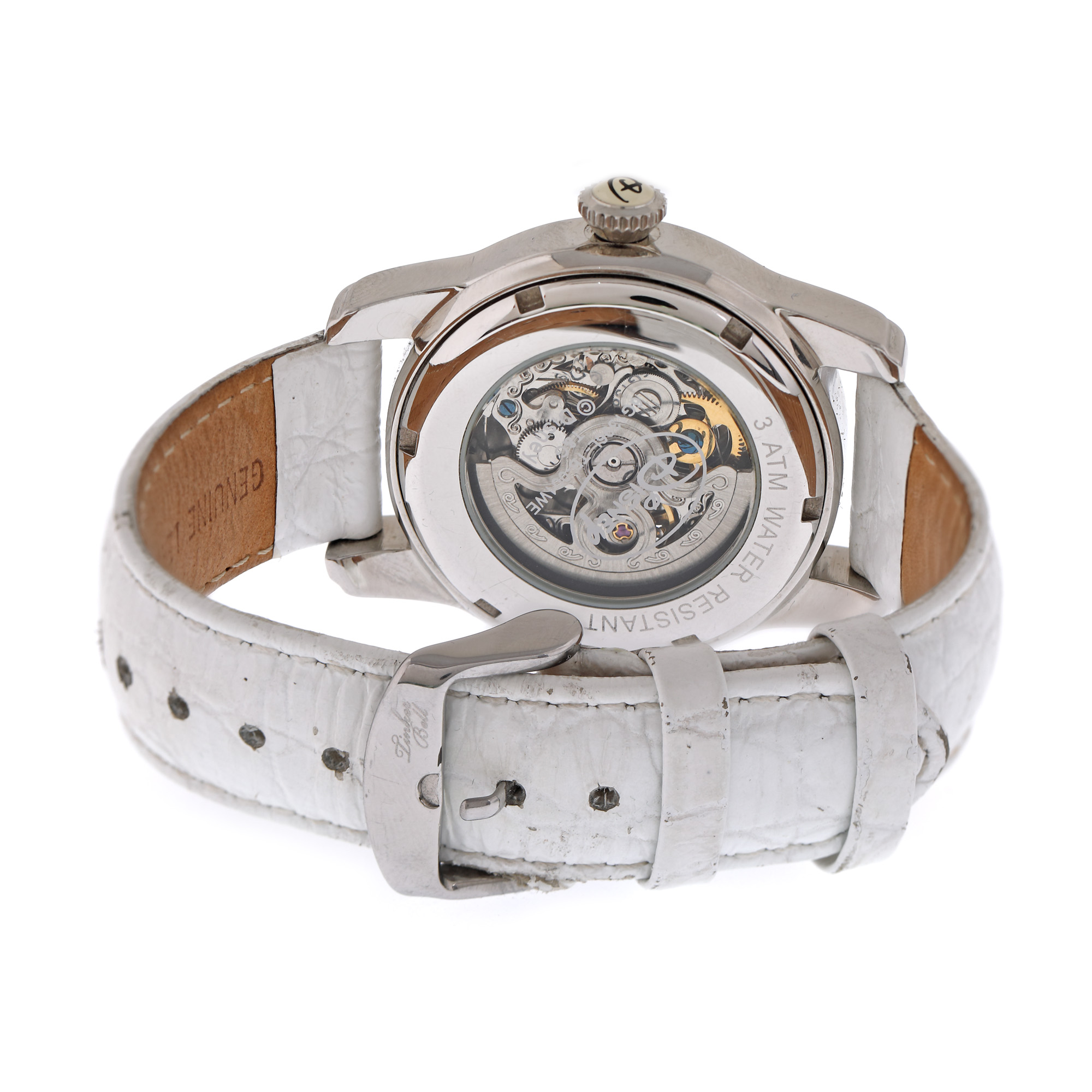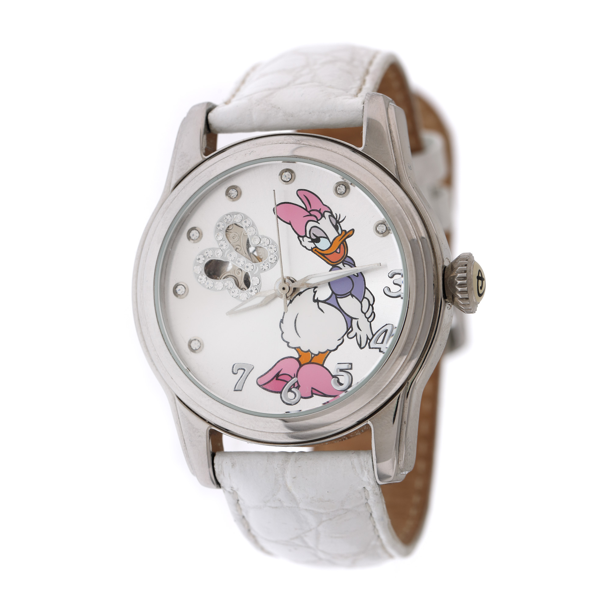 Ceas Disney Daisy, de mână, unisex, referință 6G1396L. Mecanism automatic T&G, anterior vitrat. Cadran de culoare argintiu având printată imaginea personajului animat Daisy, cu registru deschis intre orele 9 și 11 prin care se poate observa mecanismul, cu indici numerale arabe pentru intervalul orar 3-7 și cristale pentru restul orelor. Curea originală, din piele, de culoare albă, cu sistem de închidere clasic cu cataramă Tinker Bell.