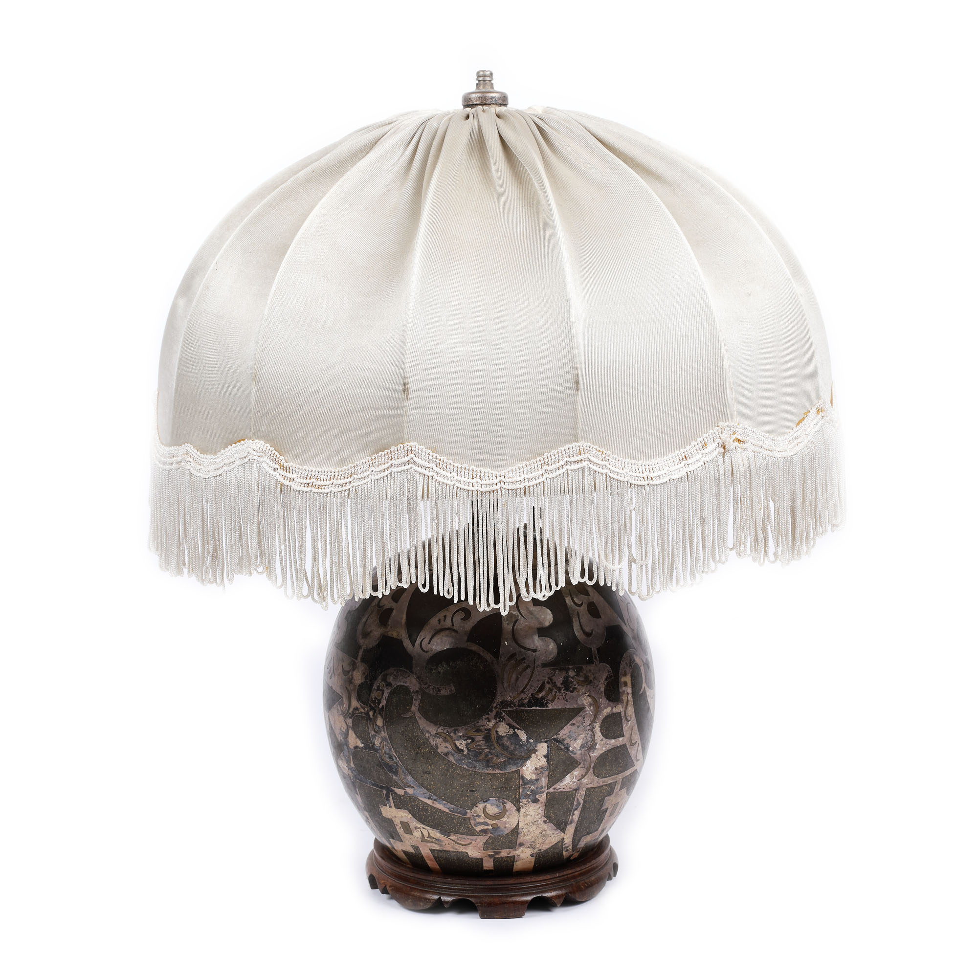 42. Lampă de masă, cu decor intarsiat de inspirație cubistă, provine din colecția actriței Stela Popescu [Jumătatea sec. XX]