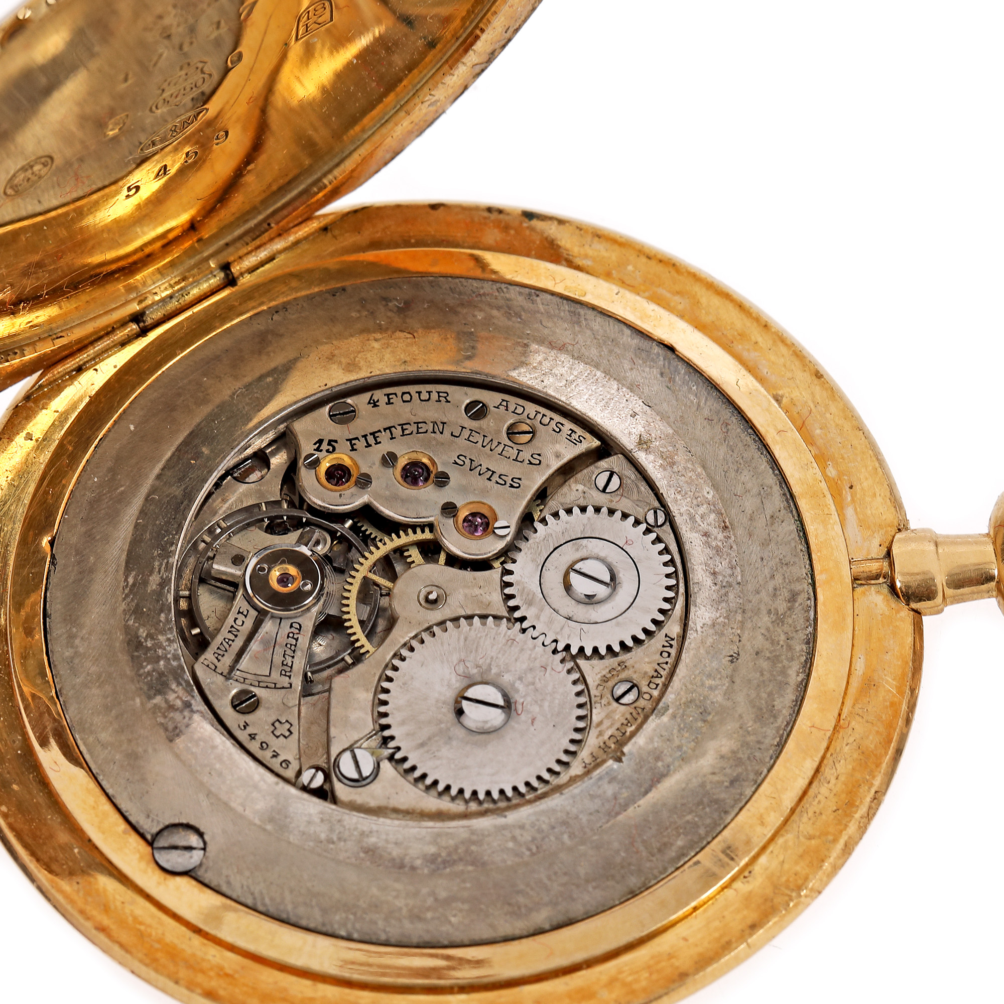 Ceas de buzunar cu lanț din aur, mecanism elvețian cu armare manuală, Movado, calibrul 34976, cu 15 rubine naturale. Cadran în două tonuri decorat în tehnica Guilloché. Capacul din spate a fost forțat.