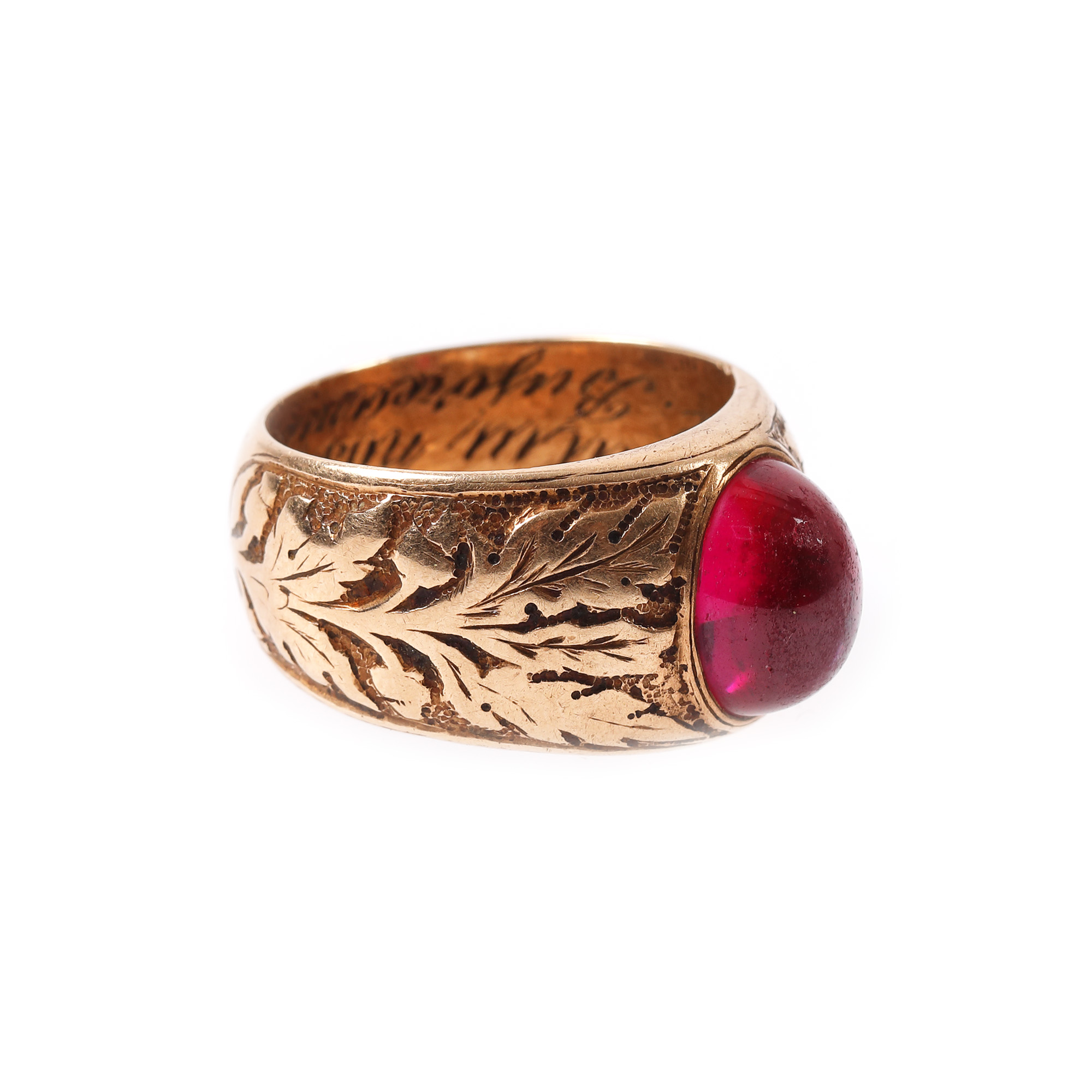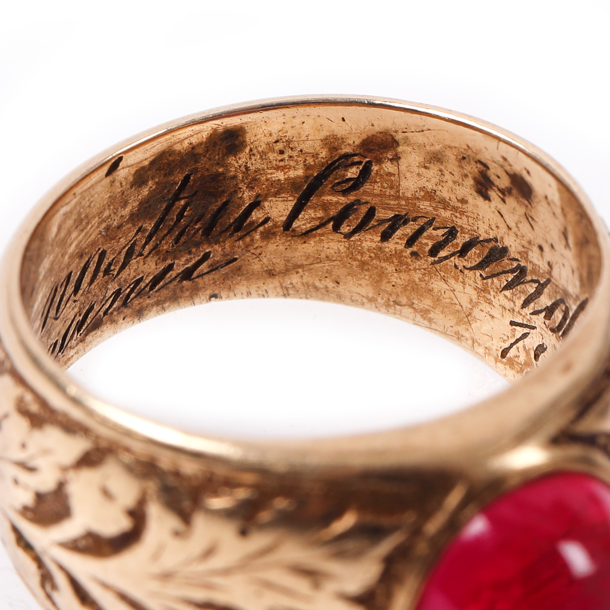 9. Inel din aur, decorat cu rubin caboșon și frunze de stejar, inscripționat în interior ”Iubitului nostru Comandant, Al. Bujoreanu, 1916”
