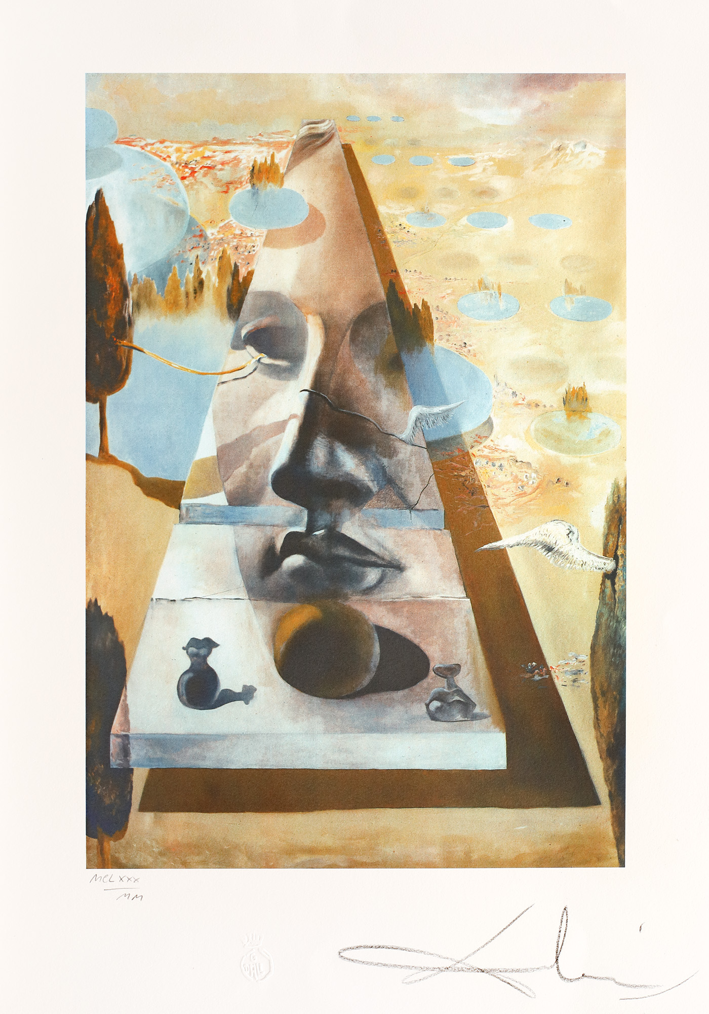 semnat dreapta jos, sub cadru, în cărbune, "Dali"; numerotat stânga jos, sub cadru, în creion, "MCLXXX/MM"; stânga jos, sub cadru, ştampila editurii, "G. Dali"