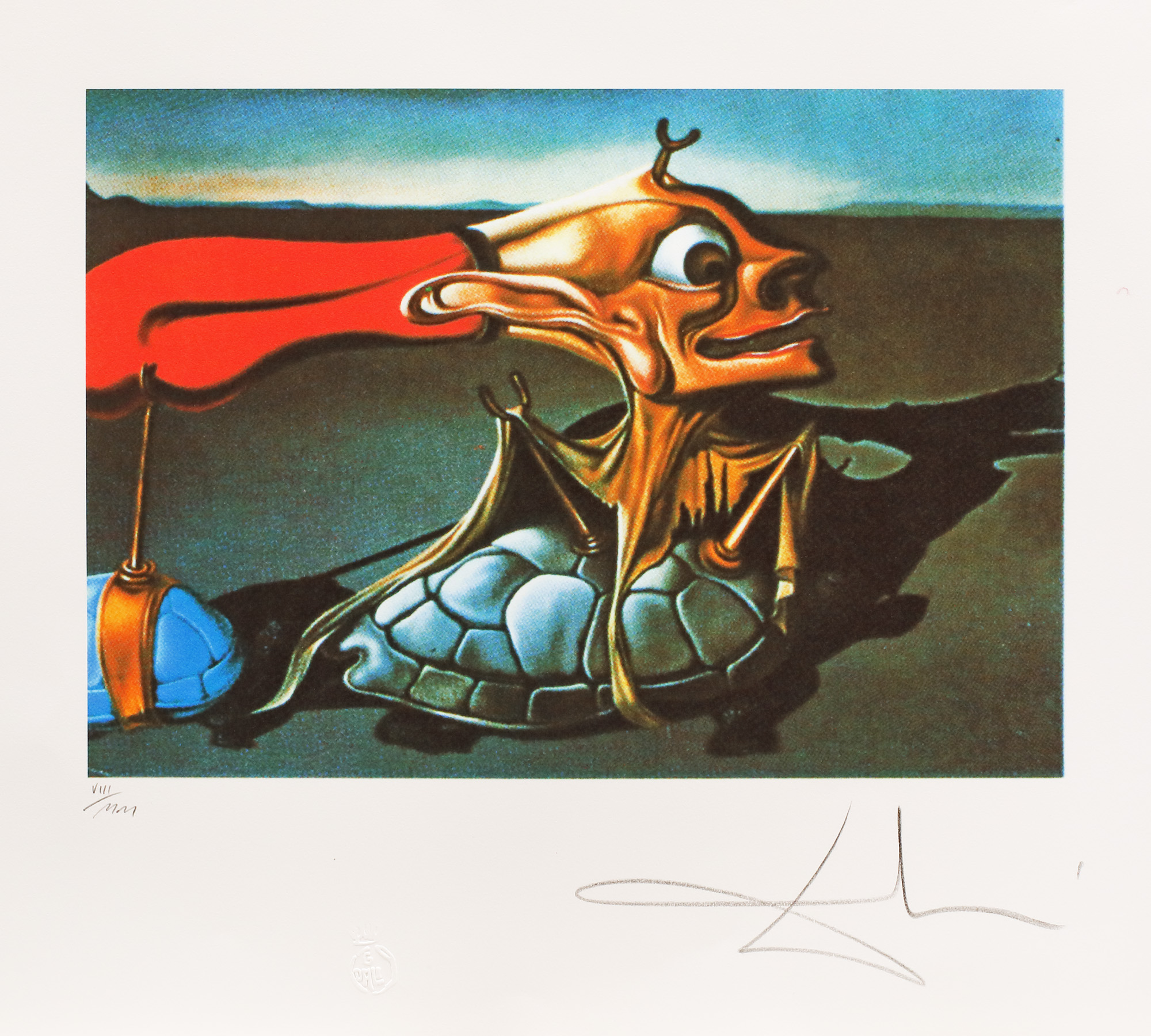 semnat dreapta jos, sub cadru, în creion, "Dali"; numerotat stânga jos, sub cadru, în creion, "VII/MM"; stânga jos, ștampila editurii, "G. Dali"