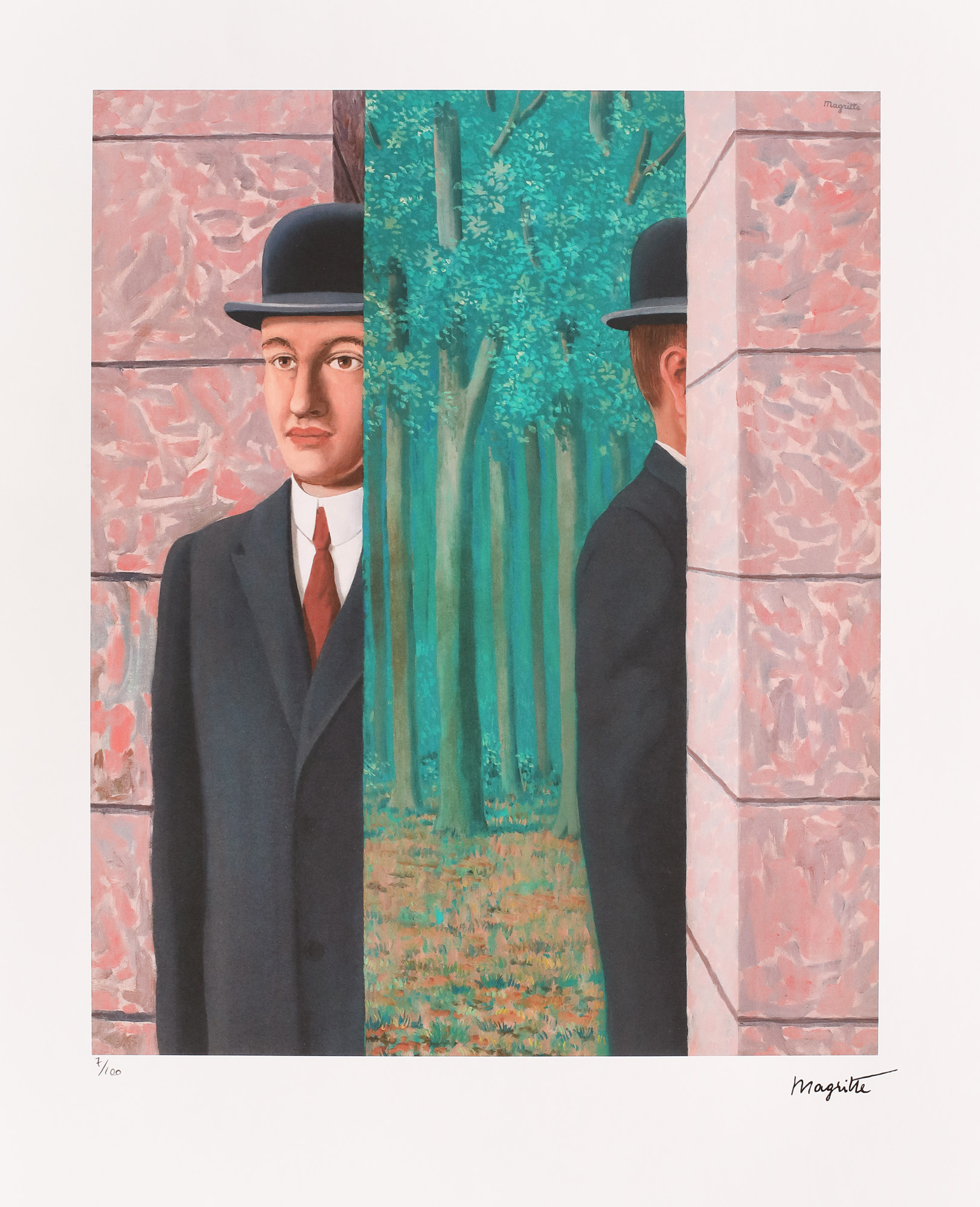 semnat dreapta jos, sub cadru, ”Magritte”; numerotat stânga jos, sub cadru, în creion, ”7/100”; stânga jos, ștampila editurii, ”SPADEM Paris”