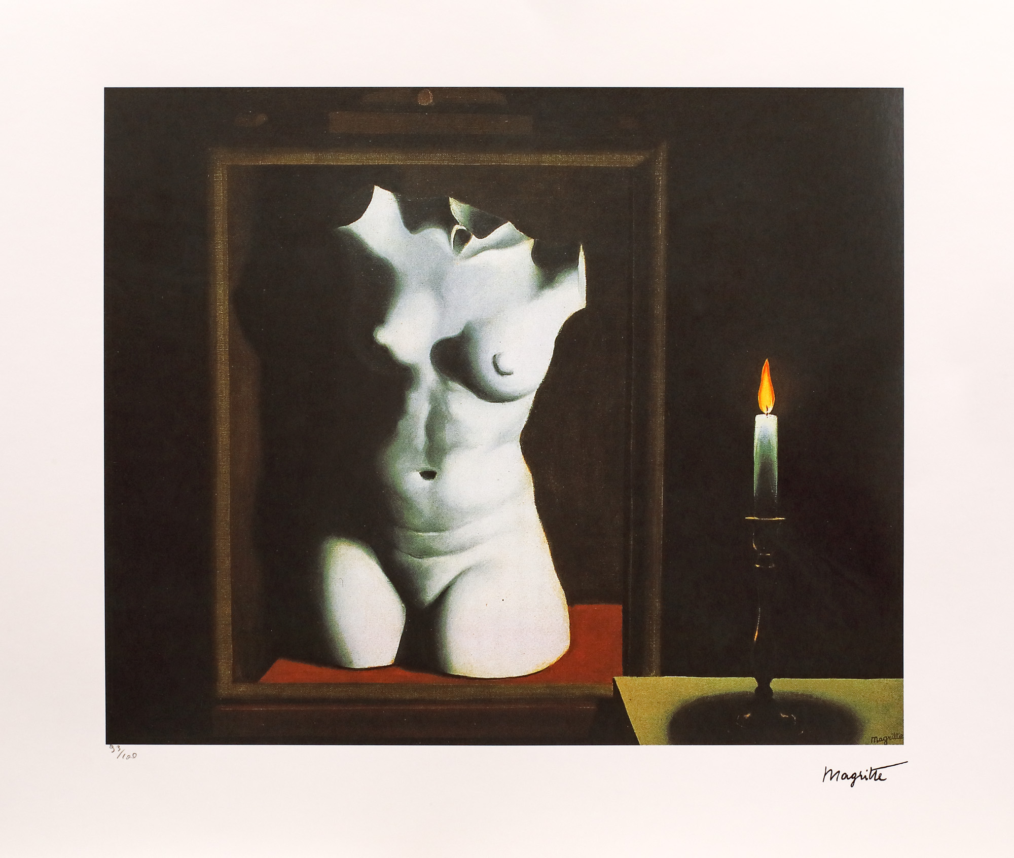semnat dreapta jos, sub cadru, ”Magritte”; numerotat stânga jos, sub cadru, în creion, ”93/100”; stânga jos, ștampila editurii, ”SPADEM Paris”