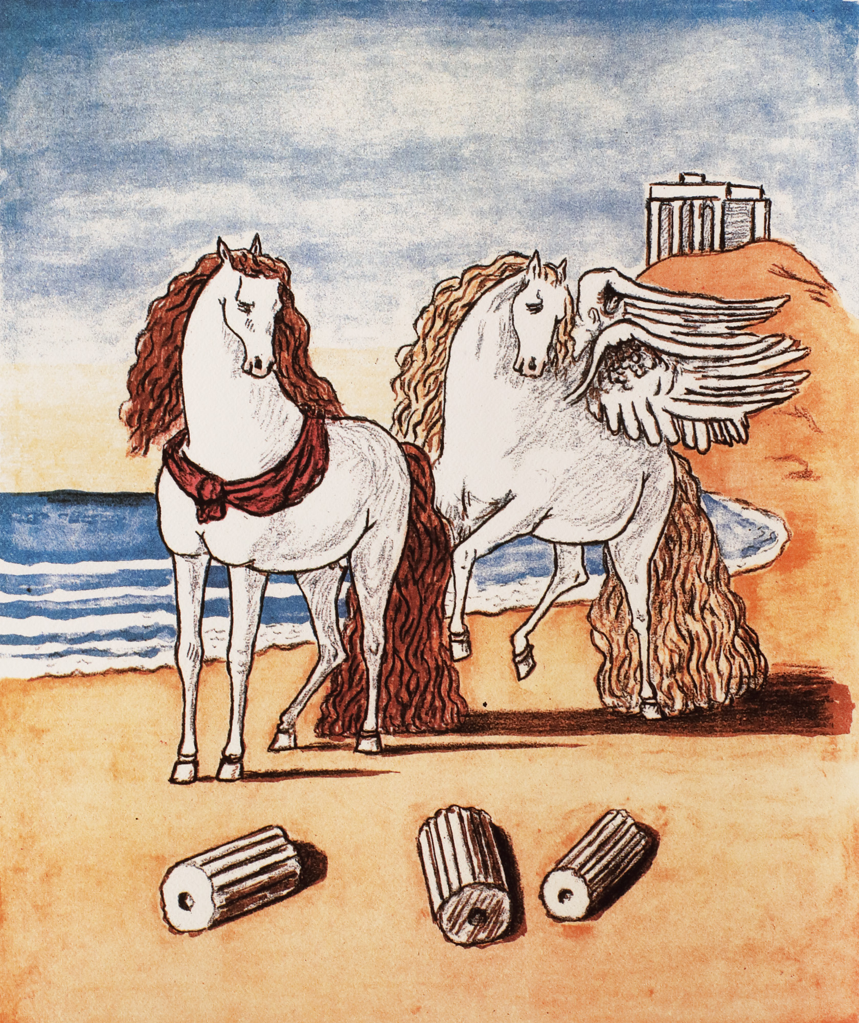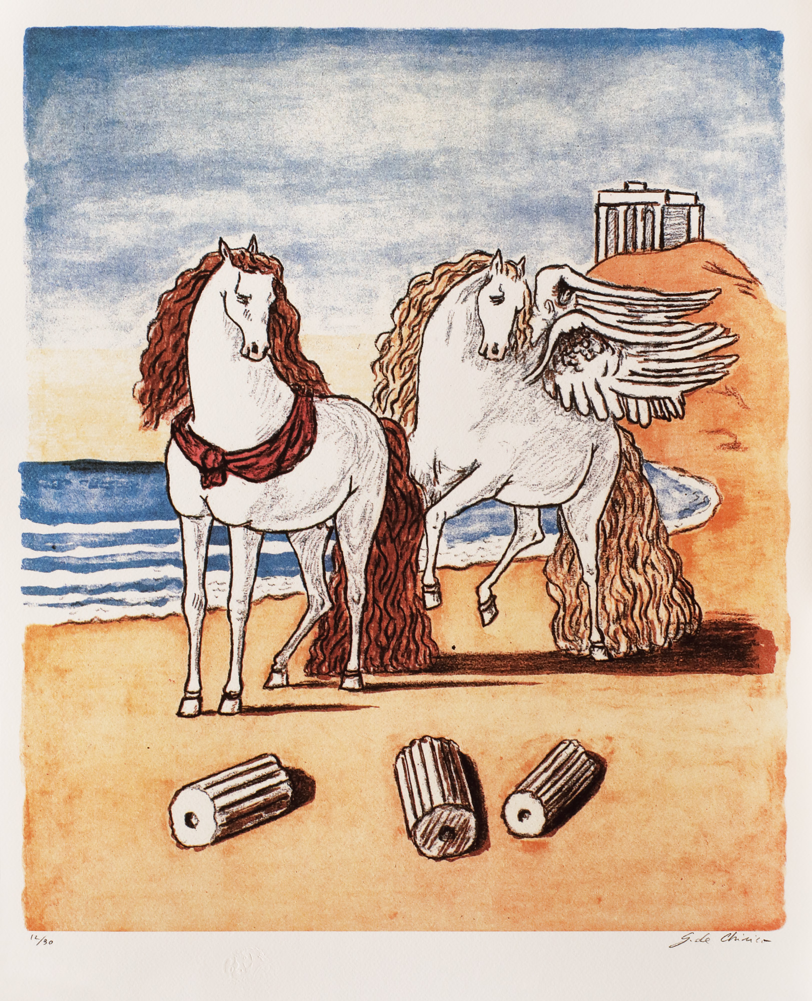 semnat dreapta jos, sub cadru, în creion, ”g. de Chirico”; numerotat stânga jos, sub cadru, în creion, ”12/90”