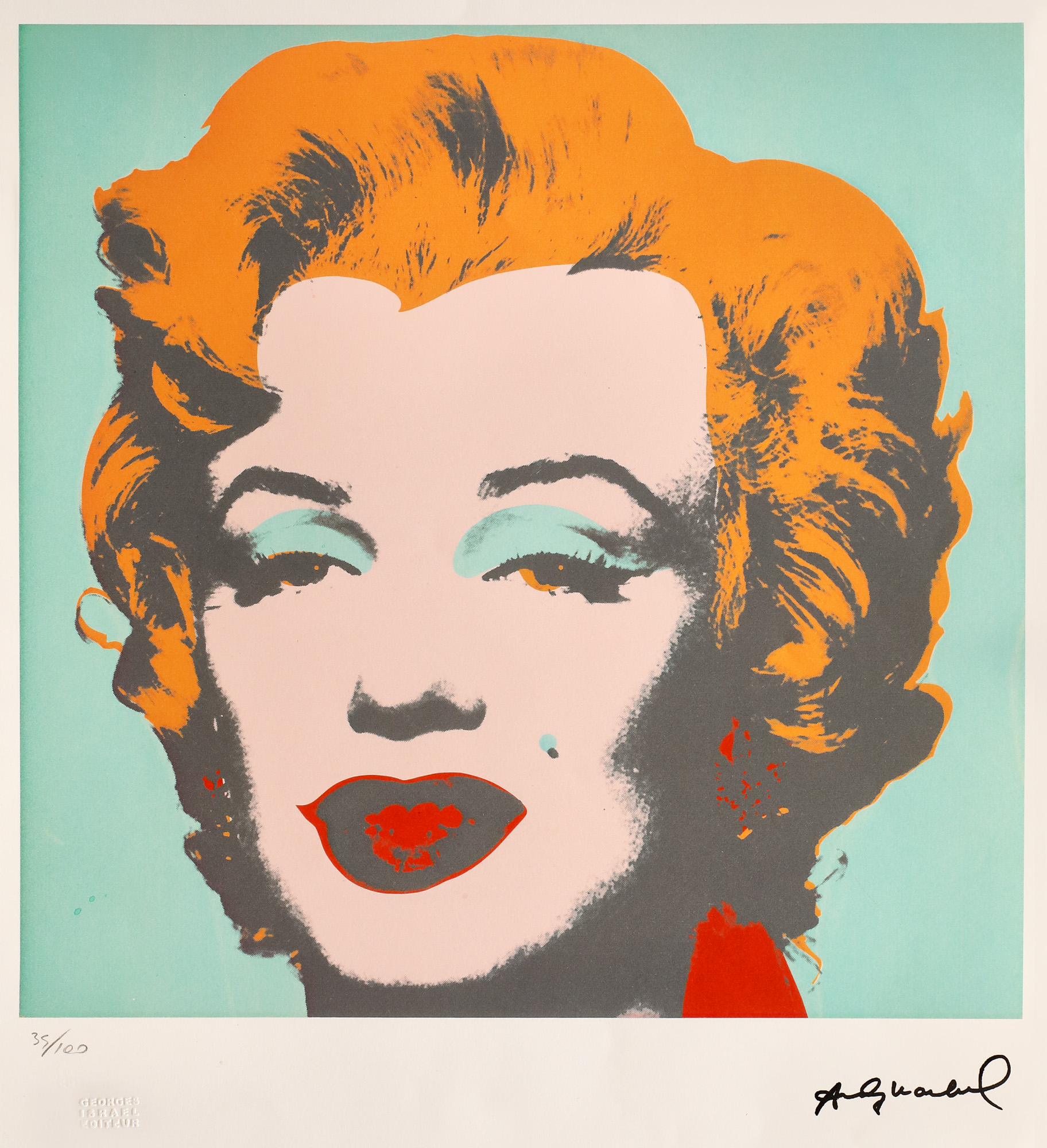 semnat dreapta jos, sub cadru, ”Andy Warhol”; numerotat stânga jos, sub cadru, în creion, ”35/100”; stânga jos, ștampila editurii, ”GEORGES ISRAEL EDITEUR”