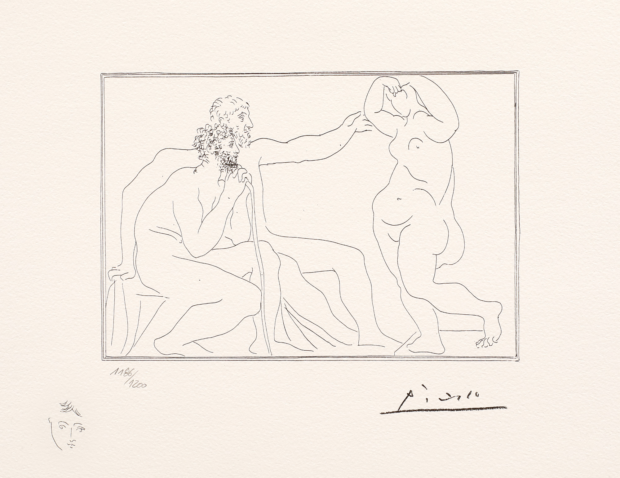 semnat dreapta jos, sub cadru, ”Picasso”; numerotat stânga jos, sub cadru, în creion, ”1186/1200”