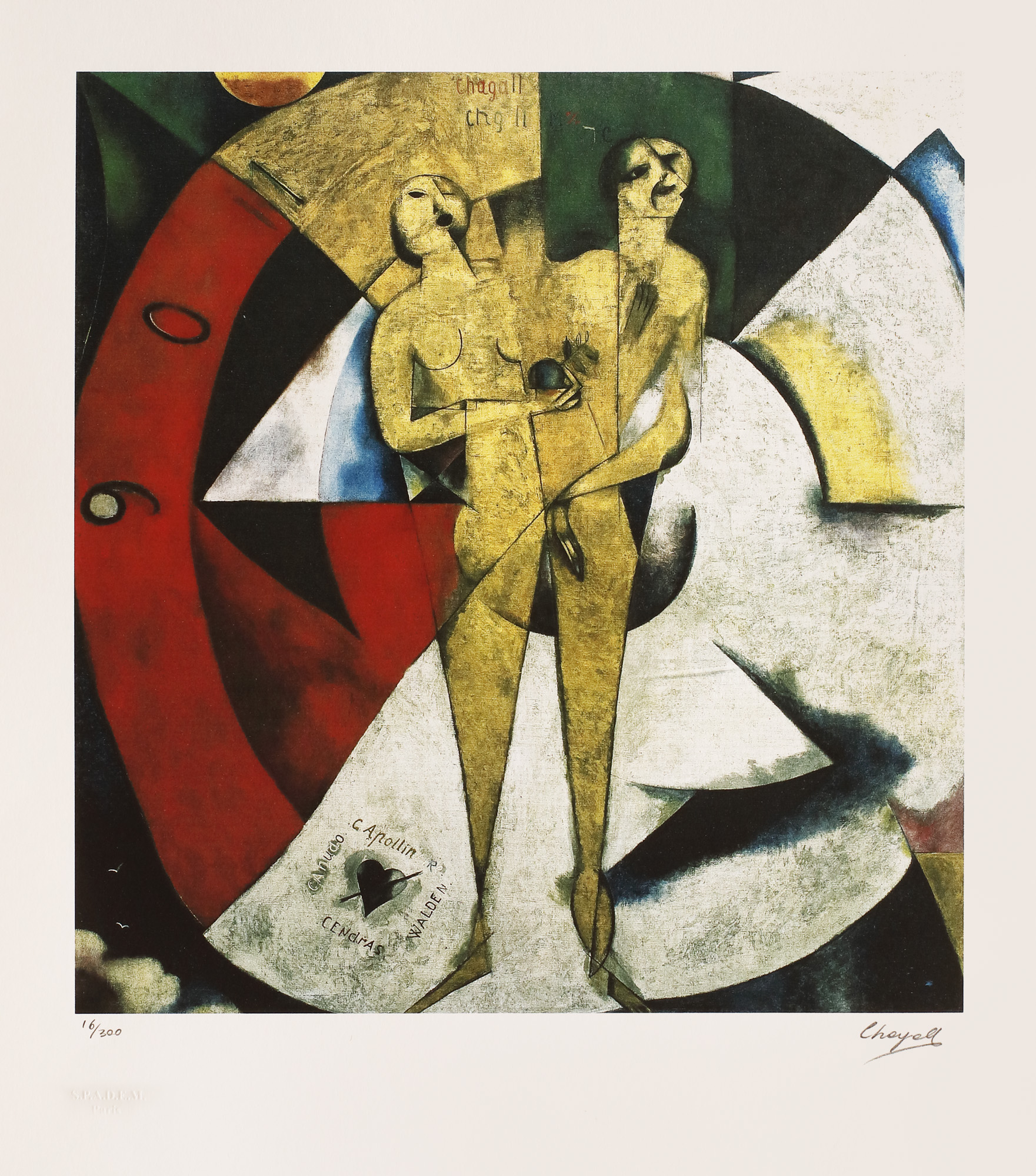 semnat dreapta jos în creion sub cadru, ”Chagall”; numerotat stânga jos, sub cadru, ”16/300”; stânga jos, ștampila editurii, ”SPADEM Paris”