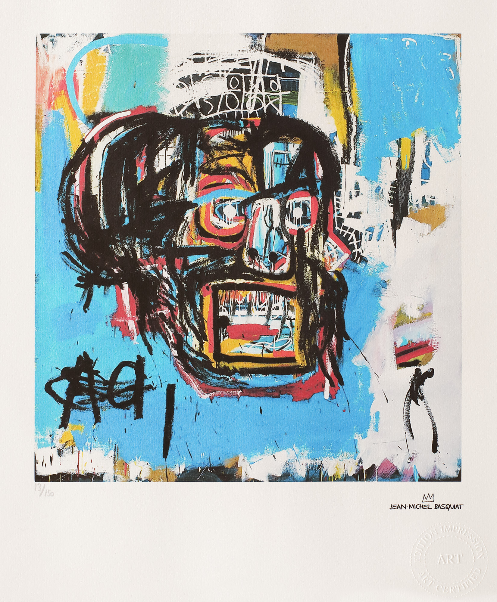 semnat dreapta jos, sub cadru, ”JEAN-MICHEL BASQUIAT”; numerotat stânga jos, sub cadru, în creion, "13/150"; dreapta jos, ștampila editurii, ”EDITION IMPRESSION ART CERTIFIED