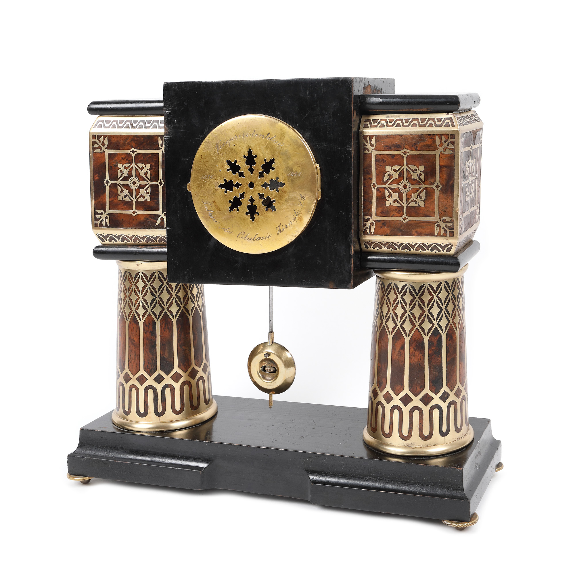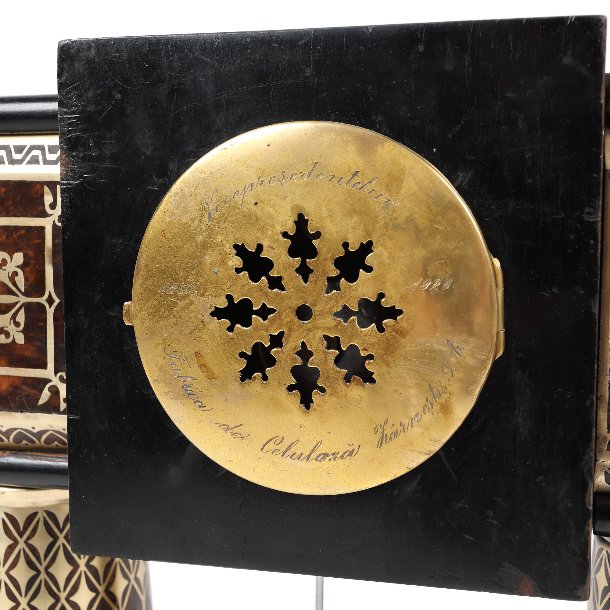 Inscripție verso: ”Vicepreședintelui Fabricii de Celuloză Zârnești S.A 1856-1926”. Mecanismul necesită revizie. Ceasul nu este însoțit de cheie. Sunt prezente defecte pe partea stângă a lotului. Marchetăria prezintă o adâncitură pe pilonul stâng. În zona superioară, în colțul stâng și cadrul frontal dreapta, prezintă accidentare.
