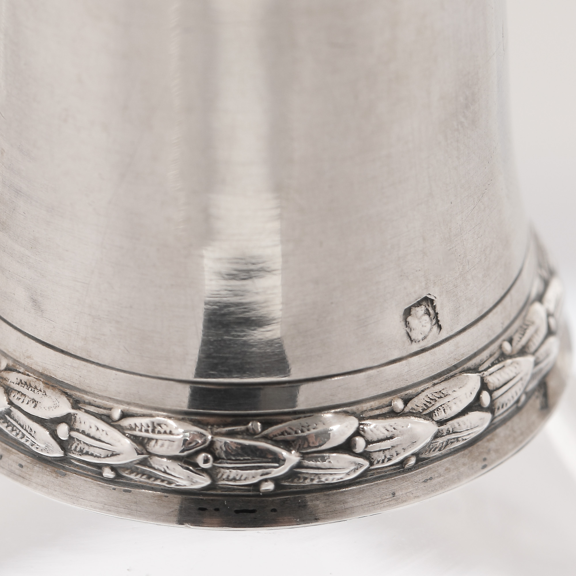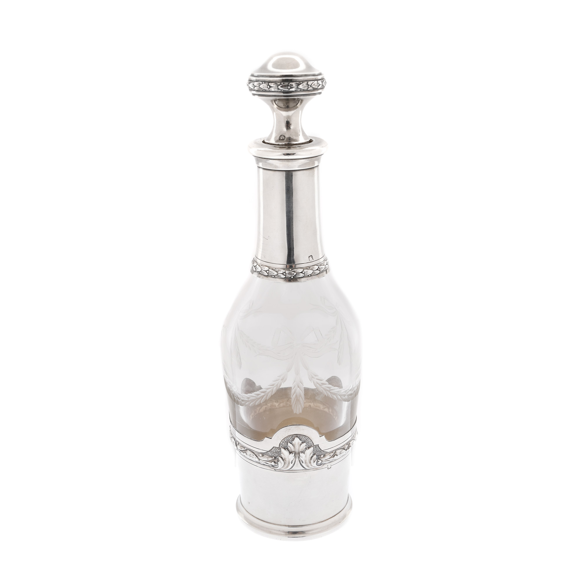 21. Serviciu din cristal și argint, format din flacon, trei pahare și tavă, pentru băuturi aperitiv, cca. 1890-1900