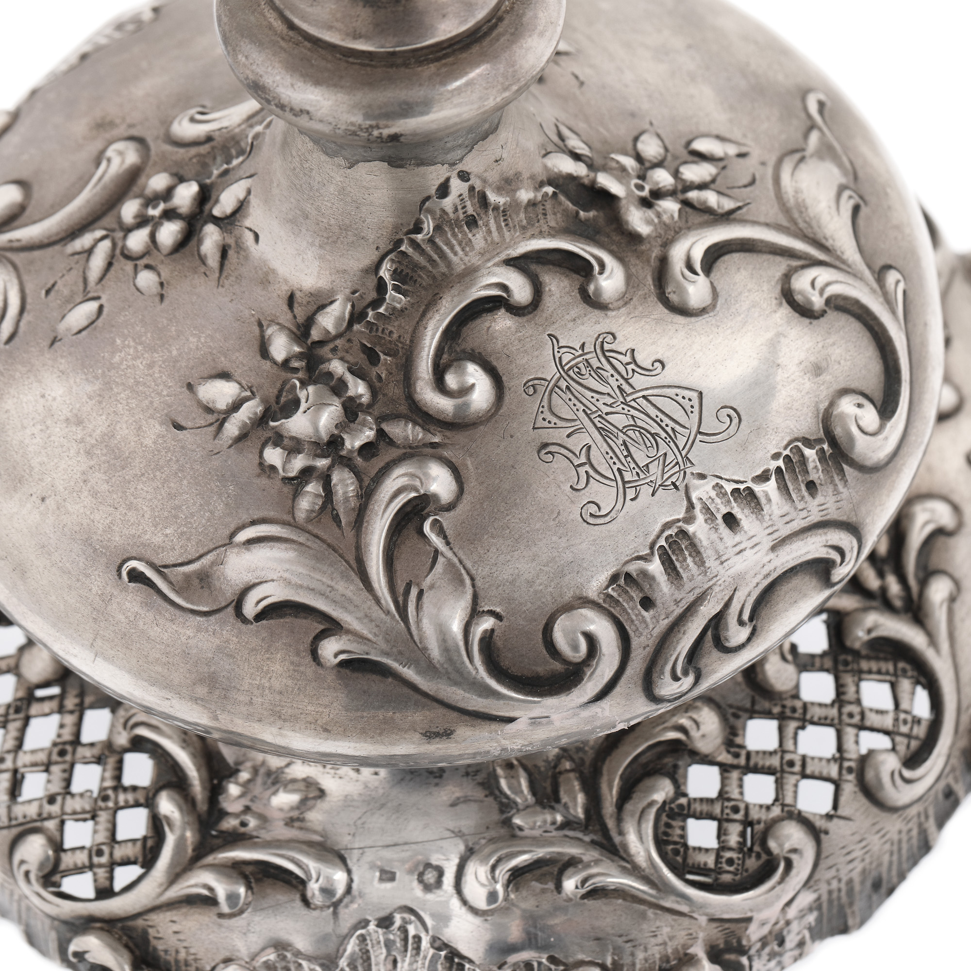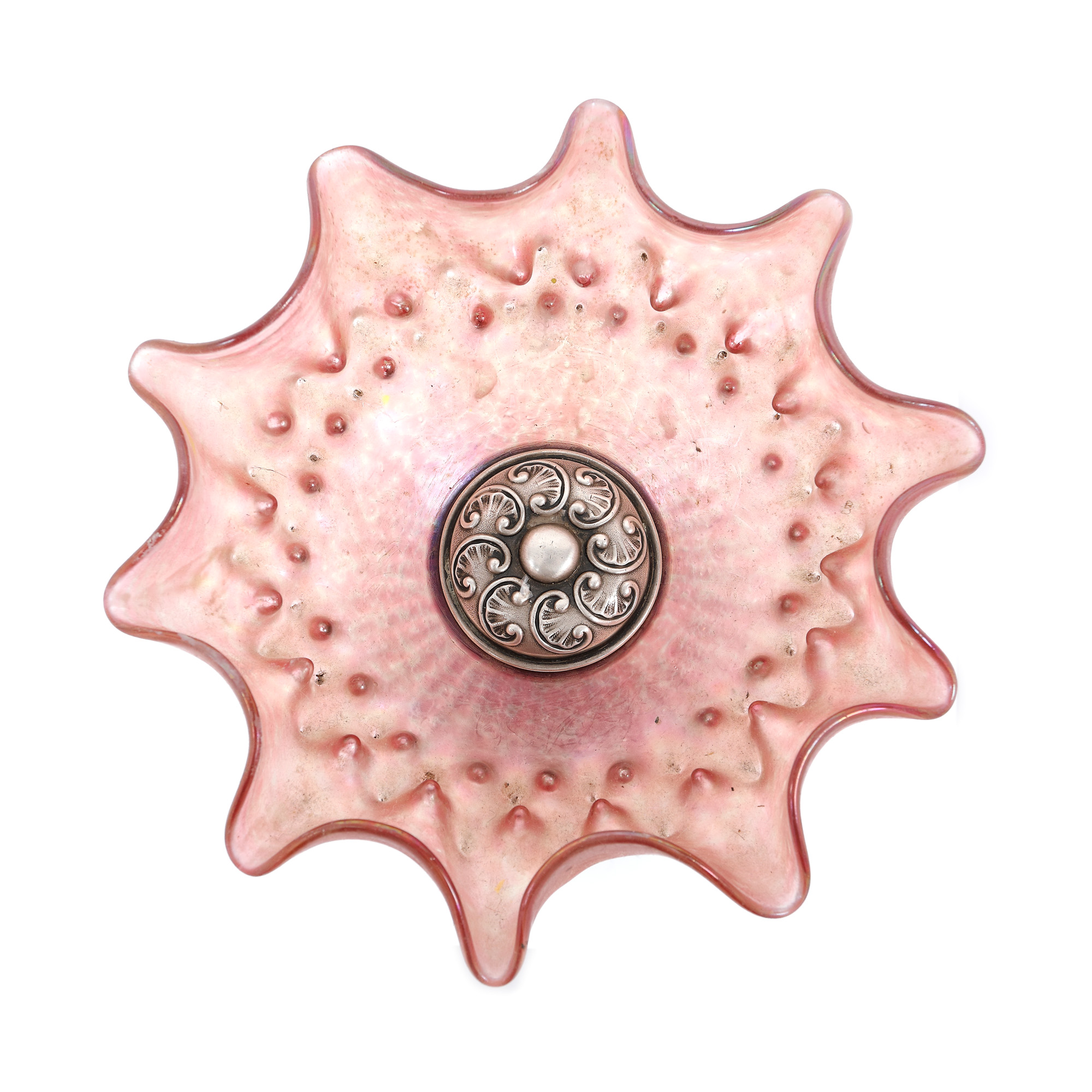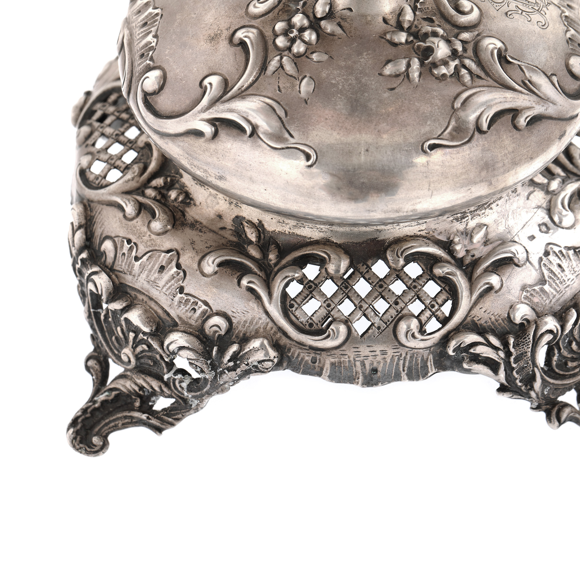 145. Fructieră din argint, monogramată, cu vas din sticlă Loetz, cca. 1900